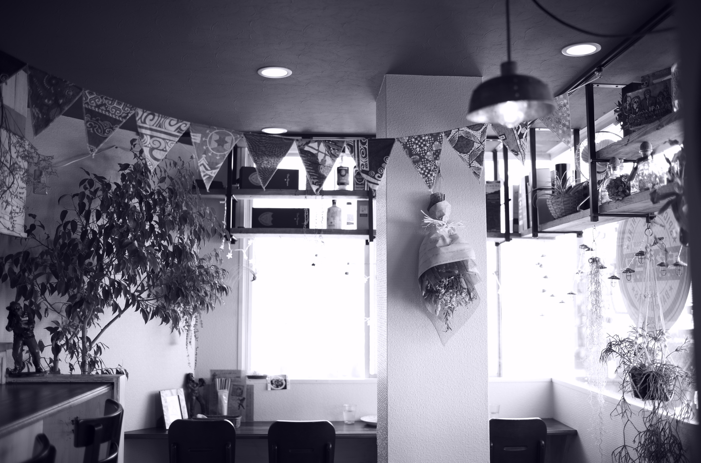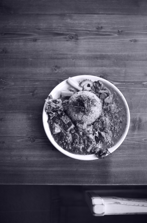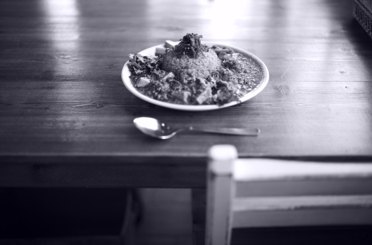 このカレーをここで紹介出来て嬉しい。でも実は、今回紹介するのかはすごく悩んだ。と言うのも実はこのカレー、色がとても美しいのだ。カレーはブラウン、ライスはターメリックカラー(イエロー)、上に載っているのは紫キャベツのバイオレット、野菜のグリーン、トマトのレッドがのっていたりとてもカラフルで華やかなのだ。だから今回はあえての選択。モノクロで色を一色に絞っての挑戦。行きたい、食べたいと思ってくれた人がいたら、それはとてもとても嬉しい。そして、いつかまたカラーで紹介できる日があれば、このモノクロの写真と並べてみたい。それも楽しいのではないかと思う。