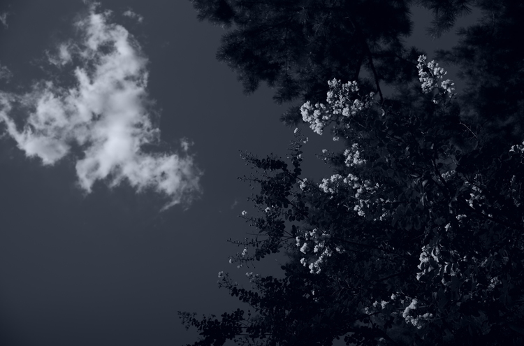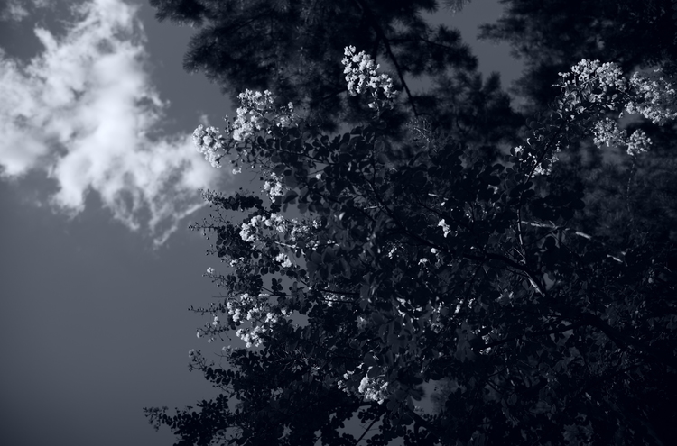 そう願いながら、JR信濃町の駅を目指した。空を見上げたら、サルスベリが咲いていた。青空に白い花びらが輝いて見えた。ふと、トーニングをブルーに変えたらどんな風に写るのだろうか。そんなことがふと頭をよぎり、ブルーに変えて撮った。