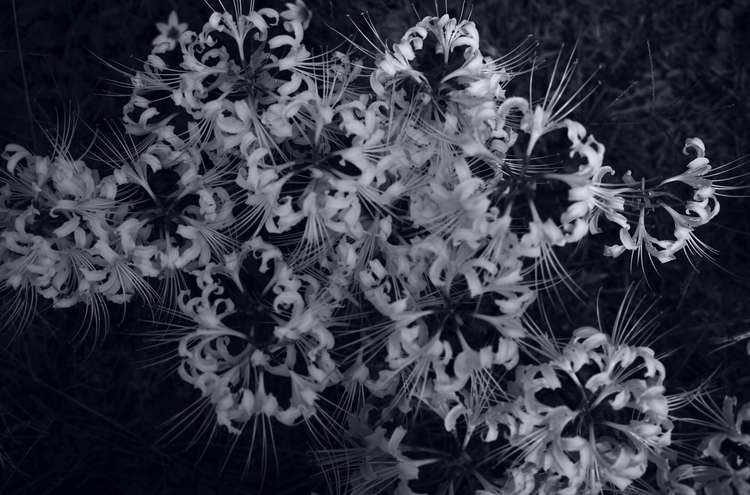 駅に向かう途中、大地に覆いかぶさるようにうっそうと茂った木々の中、遠くの方に純白の曼殊沙華が輝いているのが見えた。それはまるで舞台女優のように見えた。