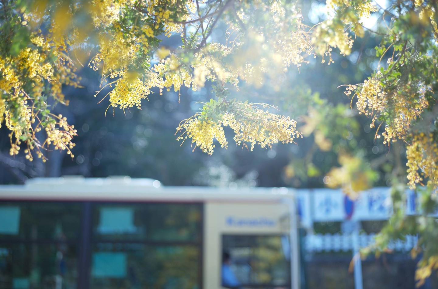 大磯駅前は毎年3月、華やかに色づく。ミモザの大きな木が満開になる。