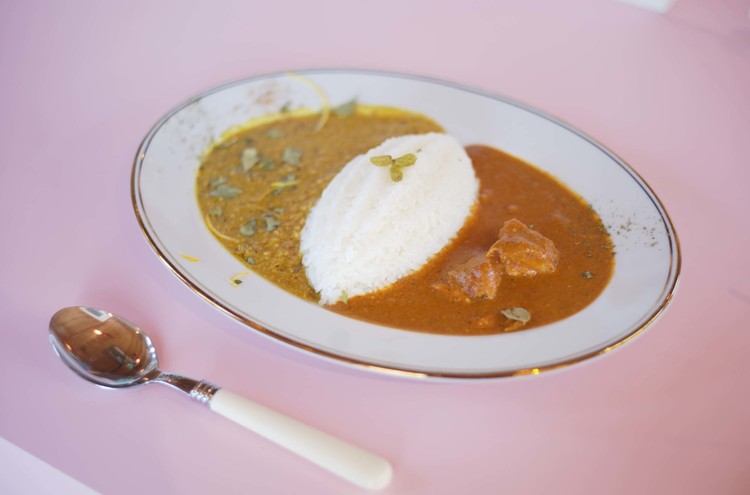 ピンク色の扉を開けると、明るい光に包まれた店内は笑い声でいっぱいだった。あっちからもこっちからも笑い声が聞こえた。スタッフの方とお客さんがとても楽しそうに話している。なんて楽しい空気に満ち溢れているお店だろう。スタッフの女性にとても丁寧にメニューを説明していただき、気持ち良くなりながらバターチキンカレーと鯛出汁が効いた鶏のカレーのダブルチョイスカレーをオーダー。サラダと冷たいチャイも注文。