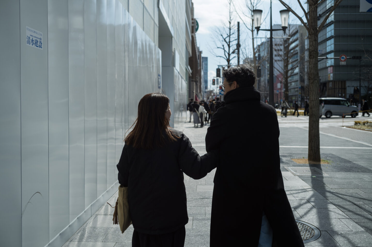 心斎橋からアメリカ村へ向かう。明るく賑やかでスナップもしやすいため、以前大阪に暮らしていた際も度々出かけていたエリアだ。2月の寒い時期ではあったが皆思い思いのファッションを楽しんでいる様子をただ眺めるのも楽しいもの。どこか店を探しているのだろうか。立ち止まってスマホでなにかを検索するカップルが目についた。レンズはライカ ズミルックスM f1.4/50mm ASPH. に付け替えたのでLIGHT LENS LAB M 35mm f/2 よりも柔らかな描写。ははあ、LIGHT LENS LAB M 35mm f/2のすっきりとコントラストの高い写りもいいけれど、この光がふわりと回り込むような写りは格別である。