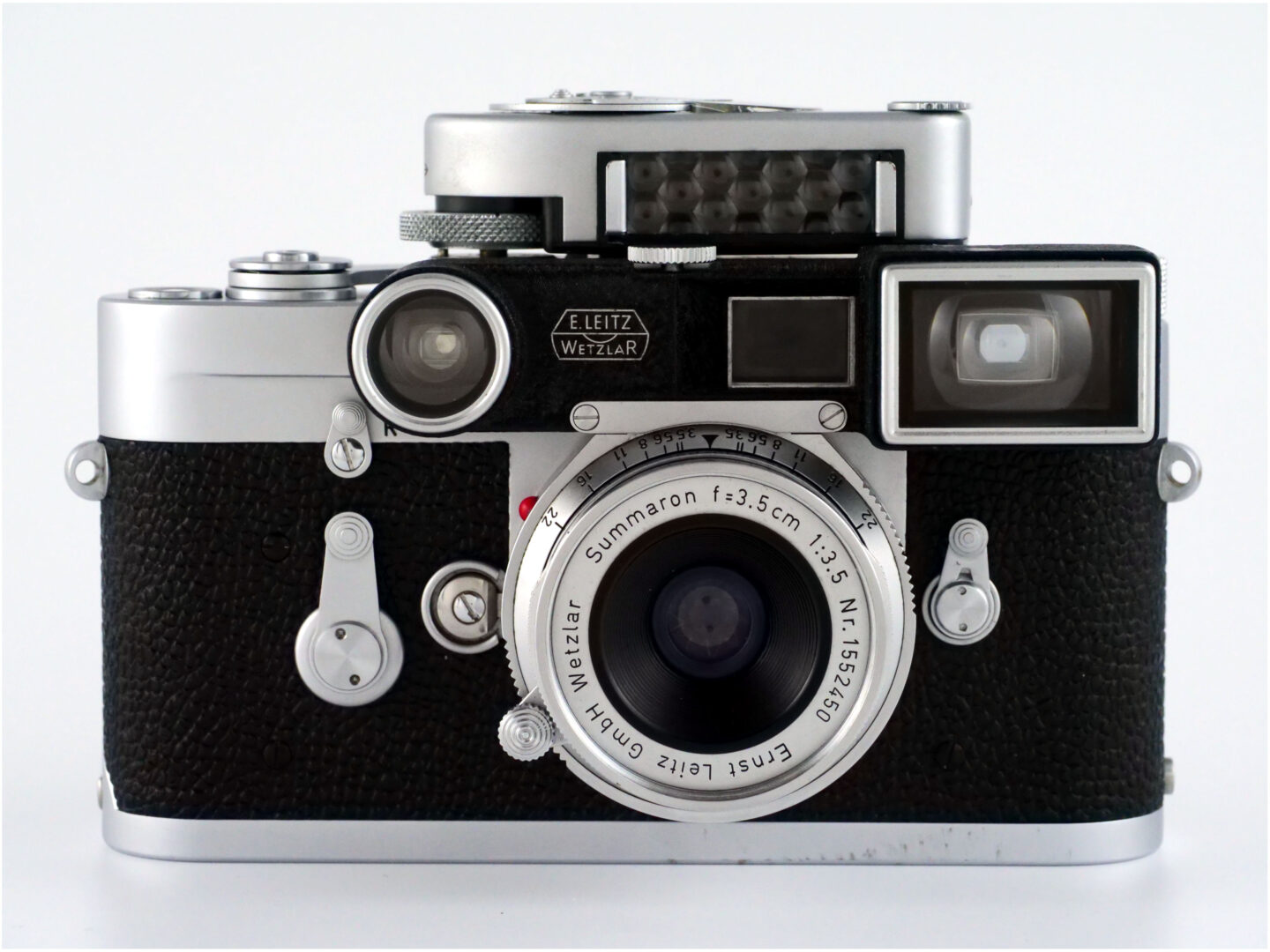 丸と四角の銀縁メガネが一体化したズマロンを、ライカM3のバヨネットマウントでシャキーン!と装着。そうすると丸いレンズが距離計像のプリズム、四角いレンズがファインダーブロックの前にピタッと収まって倍率を変えるんです。
