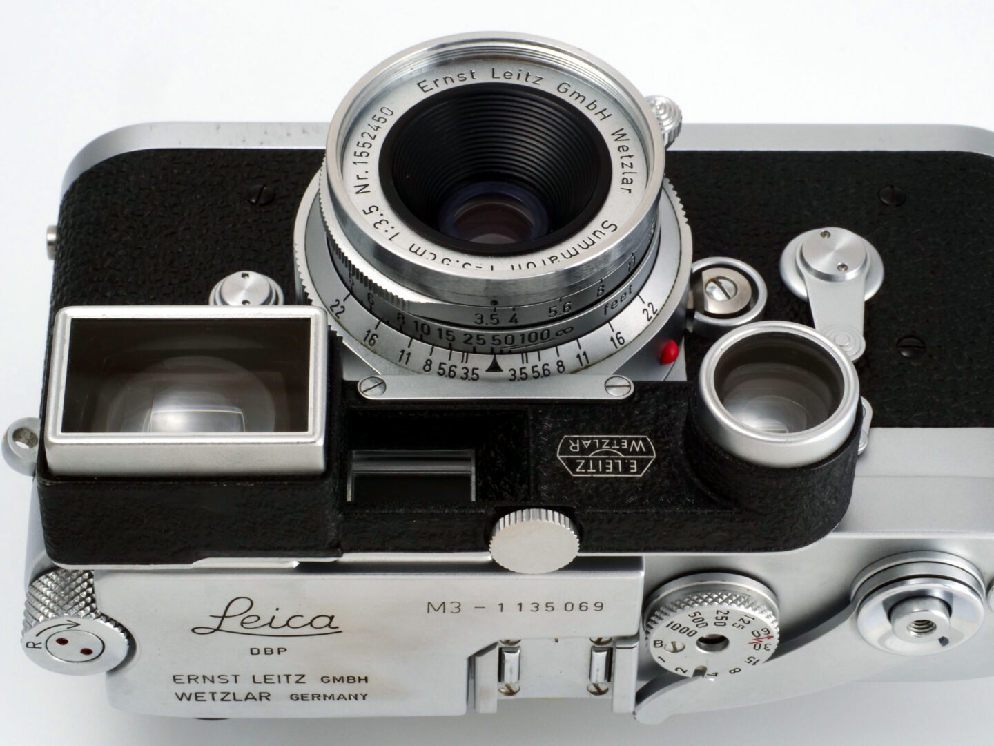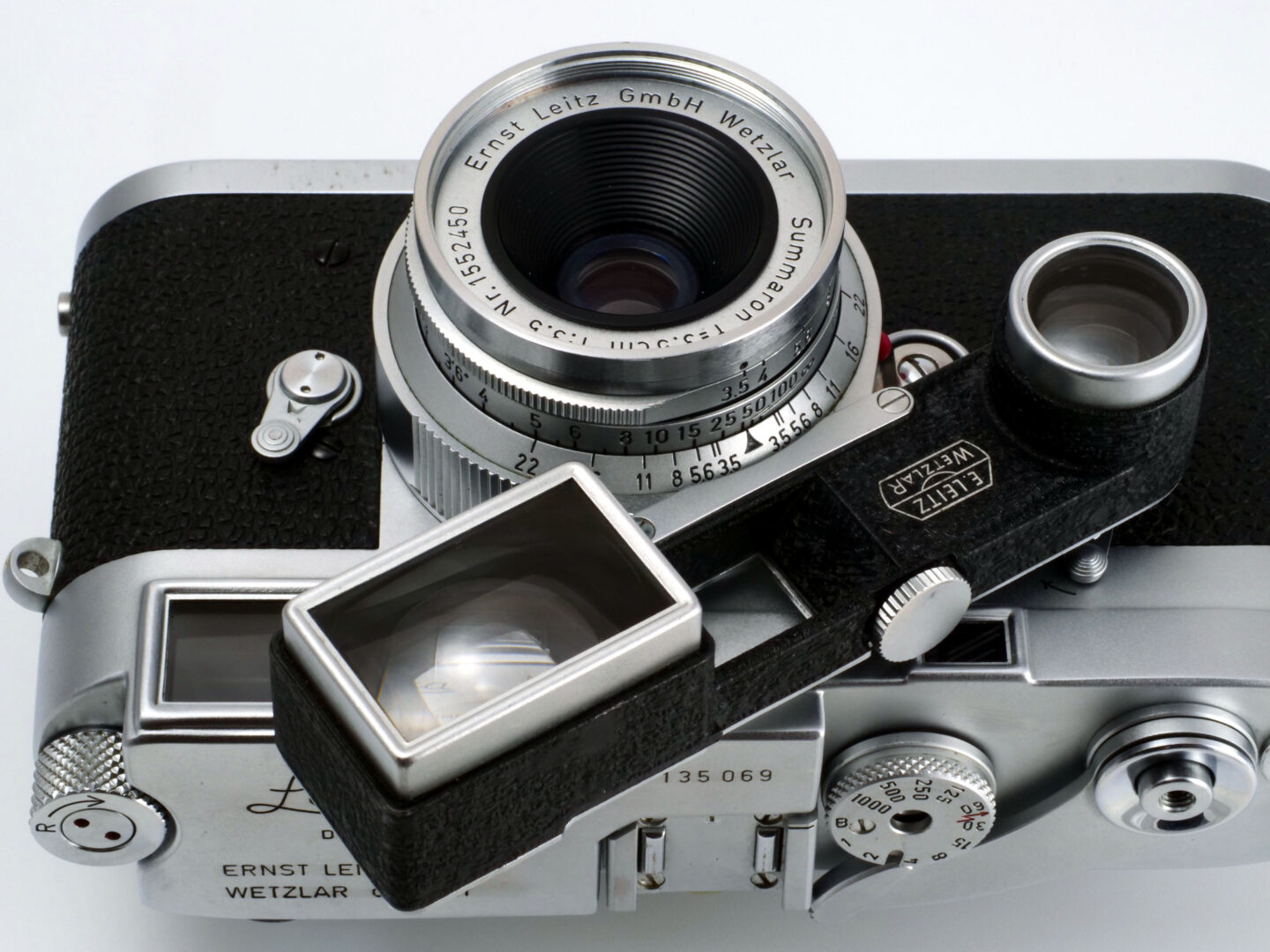 ズマロン35mm F3.5のメガネ付き。ズマロンというレンズはスクリューマウント時代から存在するライカ用の広角レンズの名称です。その後に市場投入されるF2のズミクロンやF1.4のズミルックスの影に隠れた開放F値の暗いマイナーな存在ではありますが、とにかくよく写ります。ズマロンにはF3.5の後にF2.8のモデルも開発されますが、映画に出てくるのはF3.5の方ですね。