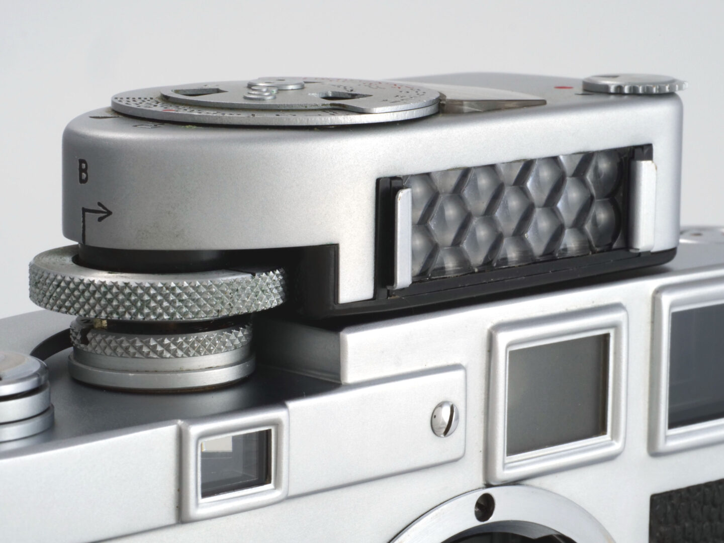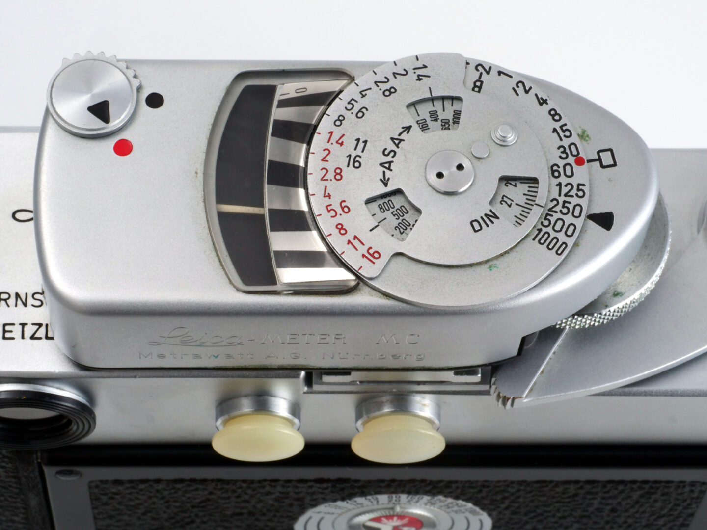 さらにカメラの見た目を派手にしているのがアクセサリーシューに装着されたライカMCメーターです。この露出計はニュルンベルグのMetrawatt社製ライカ純正アクセサリーで、カメラ本体のシャッター速度ダイヤルにカップリングさせたリングを操作することで、その速度に応じた適正露出の絞り値がアナログの指針で読み取れます。