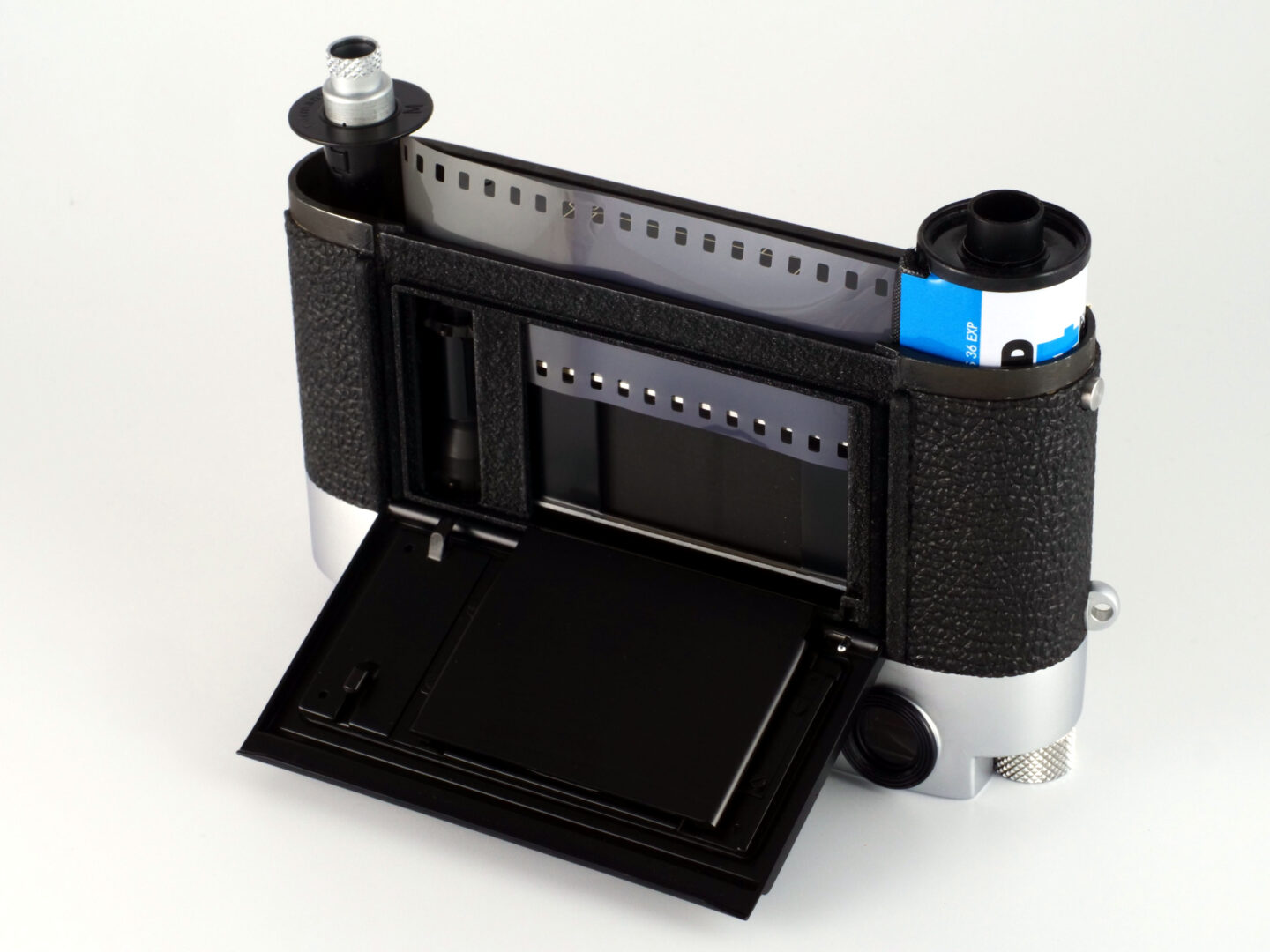 M型ライカは戦前のバルナック型ライカから受け継いで、底蓋を外すと見える細い溝に差し込むという伝統のフィルム装填方式を採用しています。M型ライカ初号機であるライカM3がバルナック型から改良された点は裏蓋がパカっと開くこと。これでフィルムのパーフォレーションがスプロケットの爪としっかり噛み合っているかどうかを確認できます。
