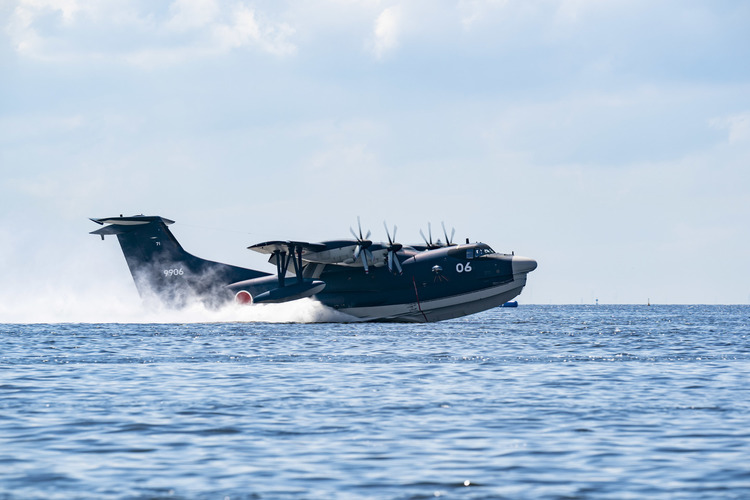 ▼海上自衛隊の水陸両用の救難飛行艇「US-2」が東京湾に初着水。