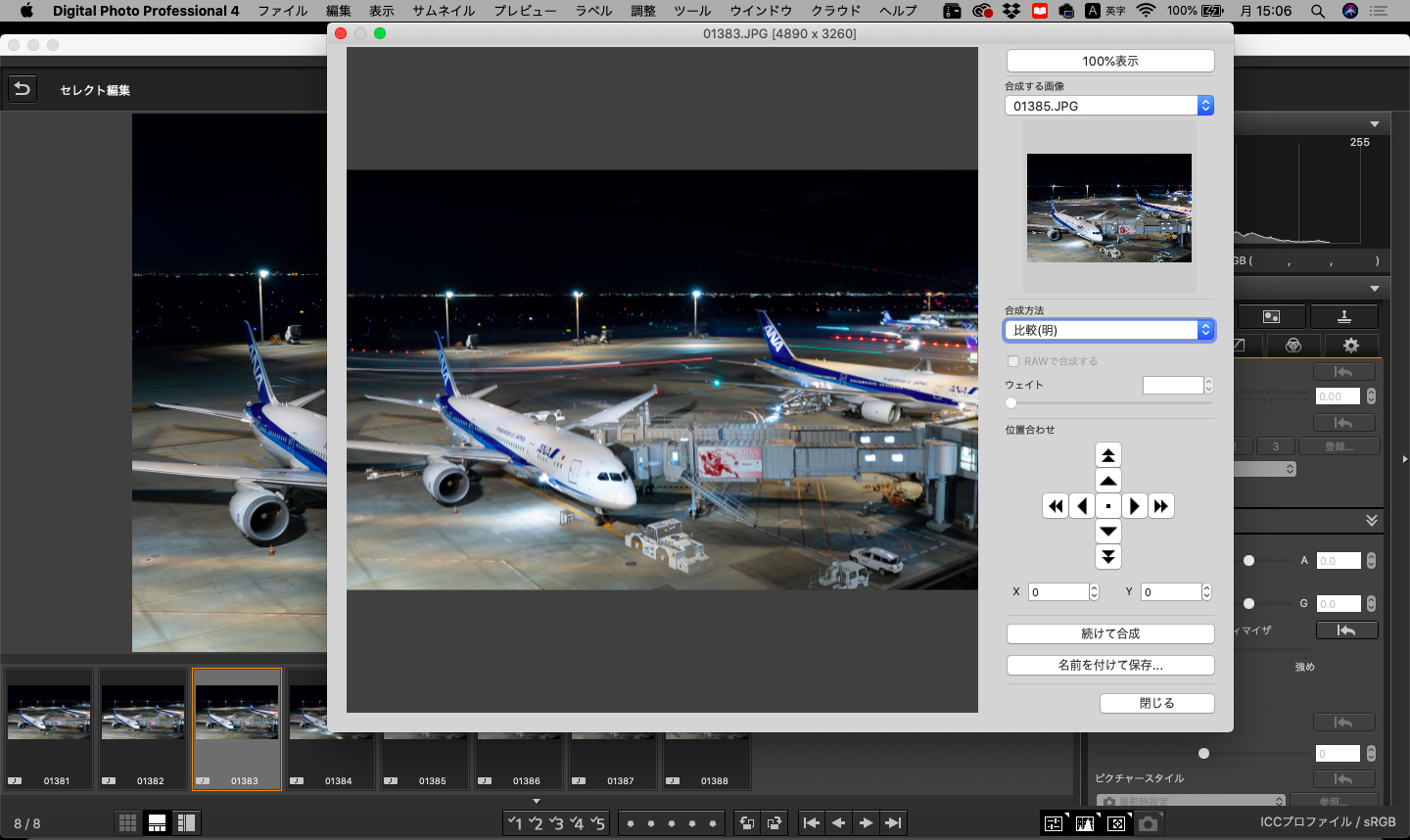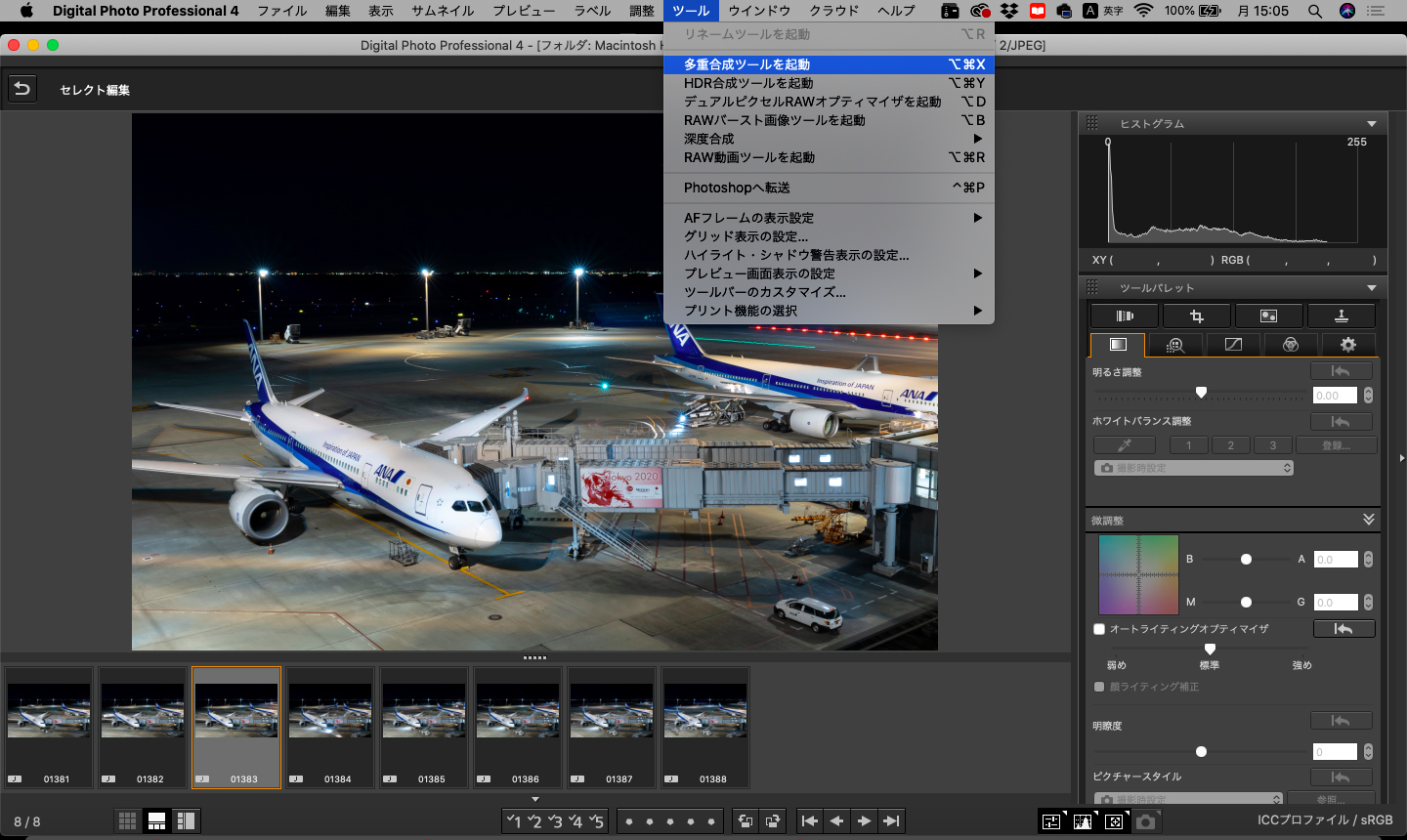 Digital Photo Professional 4を起動して、多重合成ツールを使いながら画像を重ねていきます。ツールから多重合成ツールを選択して作業開始します。
