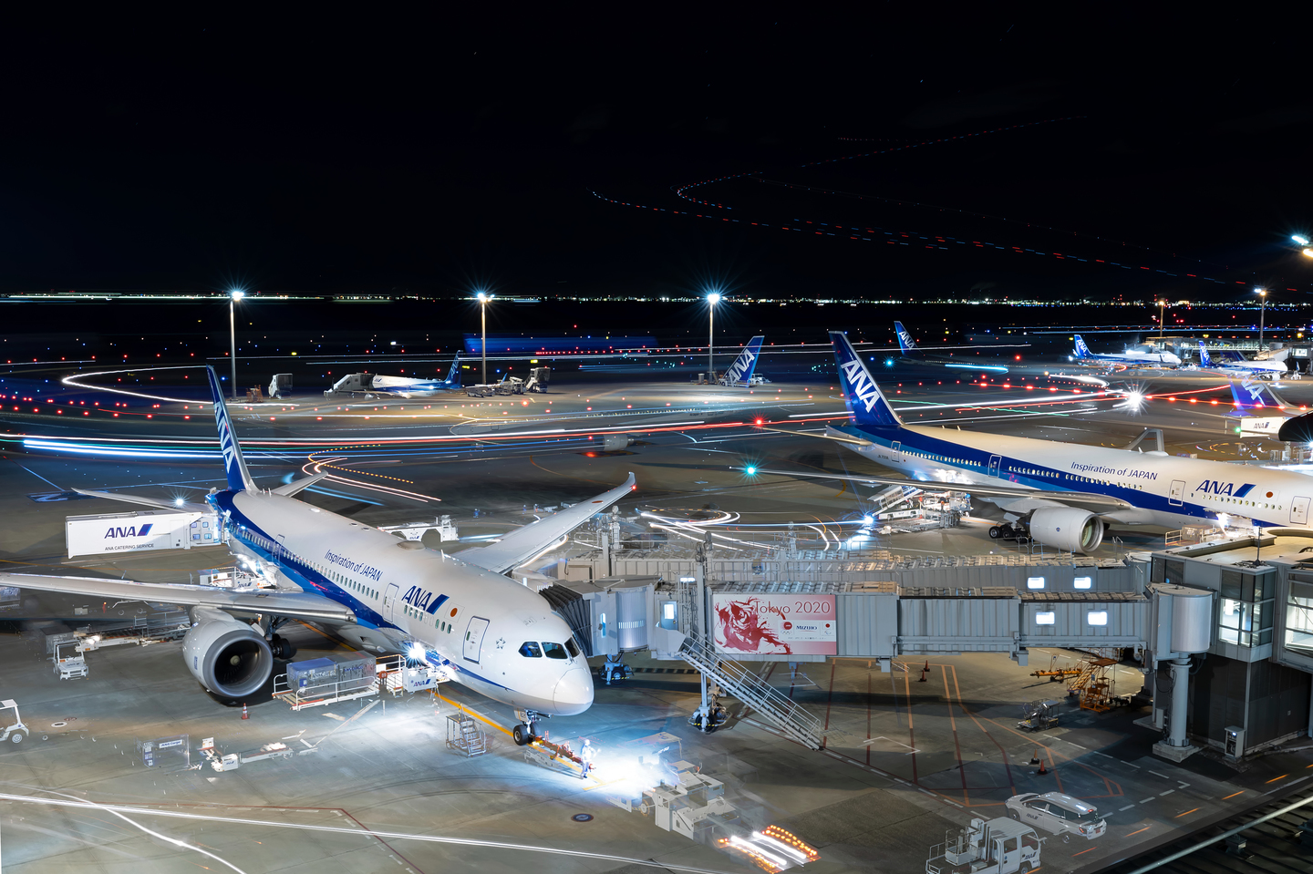 取材に訪れる日によって、駐機している機体も、飛来してくる機体も様々ですが、私のライフワークとも言える、787の撮影の為に集まってくれたのではないかと思えるほど、この日はたくさんの787がやってきてくれました。ボーディングブリッジを入れずに撮影できる位置に駐機してくれた機体は、過去にも多くの劇的なシーンを撮らせてくれた「JA821A」と言うのも嬉しい偶然でした。この作品の光跡は全て787のもの。苦難の時期に懸命に働いている空港の人々と、次世代航空機として期待されているボーイング787の作品を明るく、力強く、そして美しく創り上げる事で、この時期をみんなで乗り越えていこう、と言う想いを込めました。