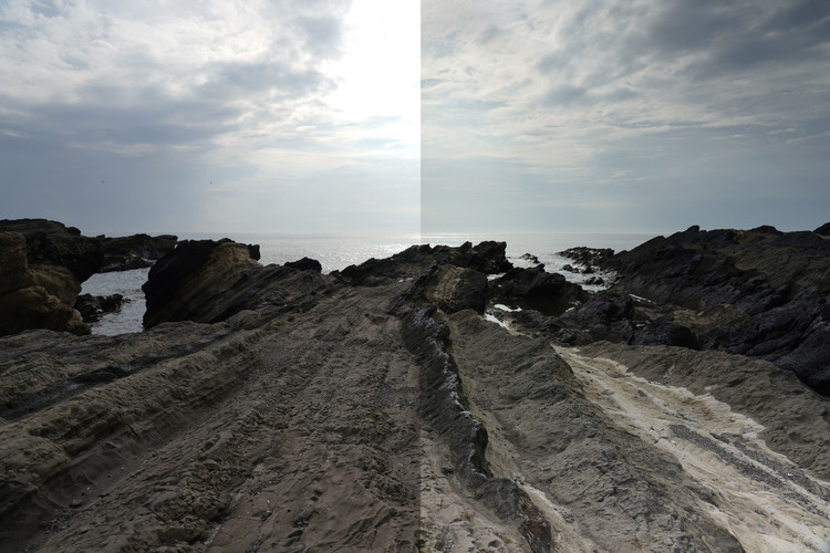 別のカットになりますが、実際にハーフNDを付けた画像と付けなかった画像を半分半分にして並べてみました。左側がフィルター無しで、右側がハーフNDフィルターを使用しています。岩肌の表情や太陽周辺の表情は、まったく違って写る事が分かると思います。