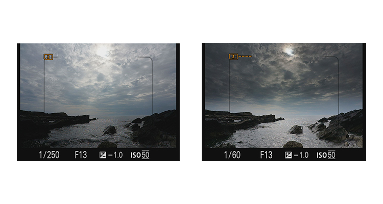 左がフィルター無しのファインダー、右がハードグラデーションND16を付けたファインダーの見え方になります。