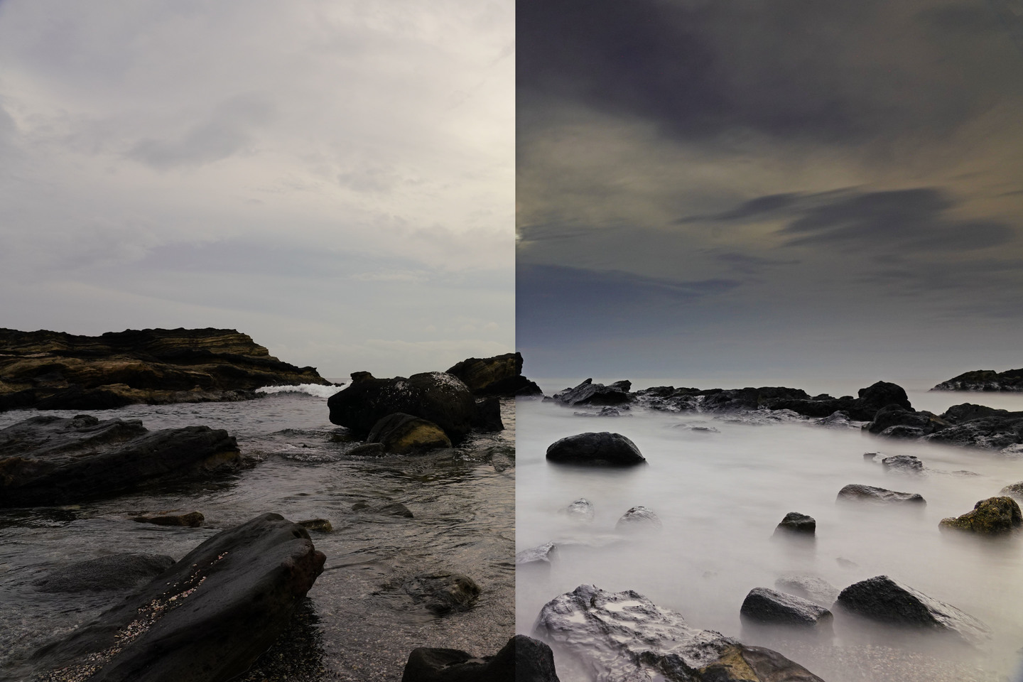 右側はフィルター無しでの撮影。左側はNDフィルター4000(絞り12段分+ハーフND16を使用。明るい時間帯でも長時間露光が可能になり、水面の表情をガラっと変える事ができます。明るい時間帯での長時間露光にチャレンジしたい方は、通常使うレベルNDフィルターでなく、思い切ったNDフィルター(1000以上)の使用をおススメします。