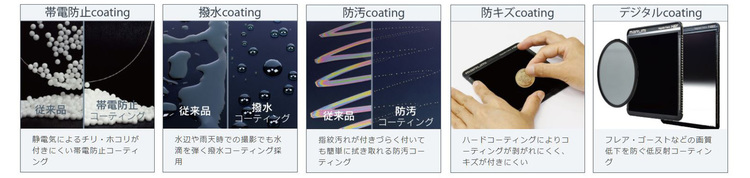 M100シリーズのフィルターは、すべて帯電防止、撥水コーティング、防汚コーティング、防キズコーティング、デジタルコーティングがされており、様々なフィールドで安心して使用できるフィルターです。特にマグネットフレームを採用している角型フィルターは、他社のフィルター枠のないものに比べて、枠の部分を持って交換作業等も出来るため、フィルターに指紋や汚れが付着するのを軽減できます。