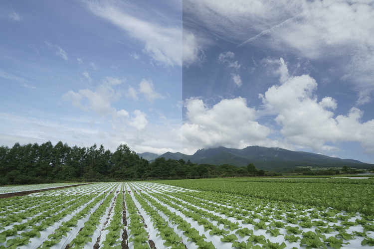 上の写真は、同じ位置からEXUS CIRCULAR P.L Mark IIフィルターの有無しの写真を合わせたものです。左半分はフィルター無しで右半分がC-PLフィルターを付けた状態で撮影しています。