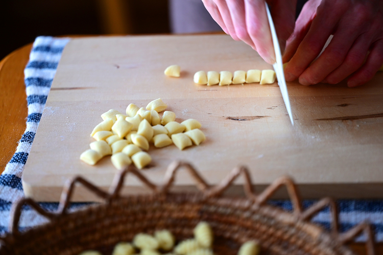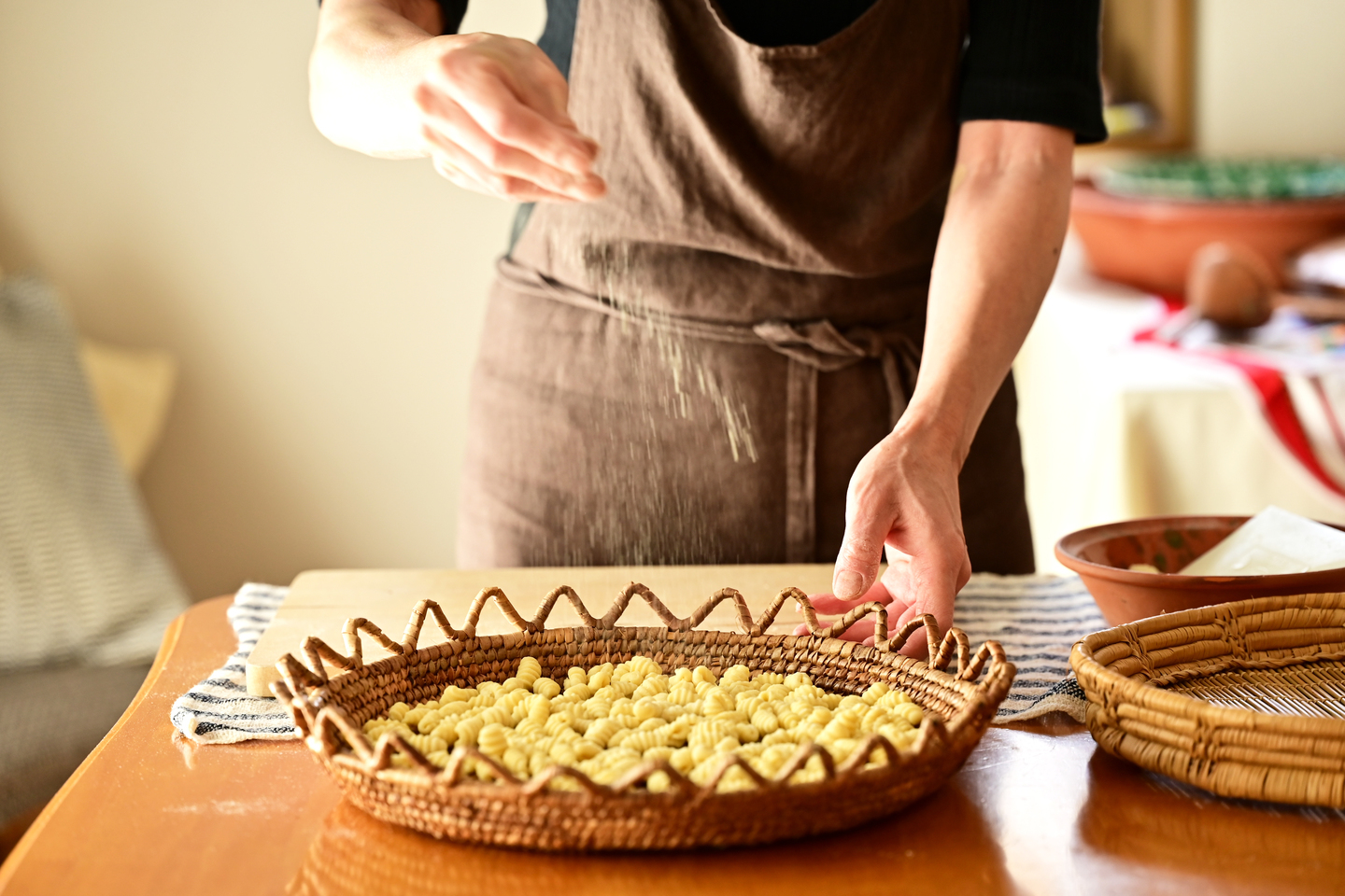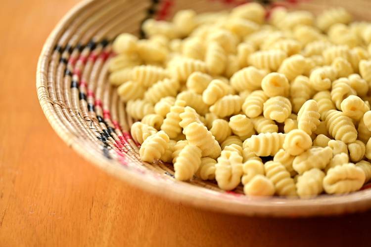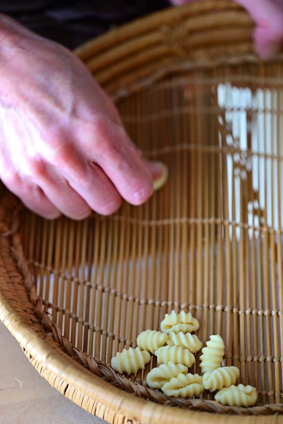 そのほかにも復活祭前に子どものために作られていた鳩のような形の「カオンパザ」、モルゴンジョーリ村でお祭りのときに食べるリングの形の「ロレギッタス」、今では作れる人が少なくなってしまった神の糸という意味の「フィリンデゥ」、生地にマッシュポテトを包み込んだ餃子のような「クルルジョネス」など、話を聞いているだけでパスタ博物館にいるようです。今回のパスタは「マロレドゥス」というフレーゴラの次に伝統的なパスタです。かごや専用の器具を使って、筋の模様をつけるのでパスタソースがよく絡み、美味しくなるパスタです。