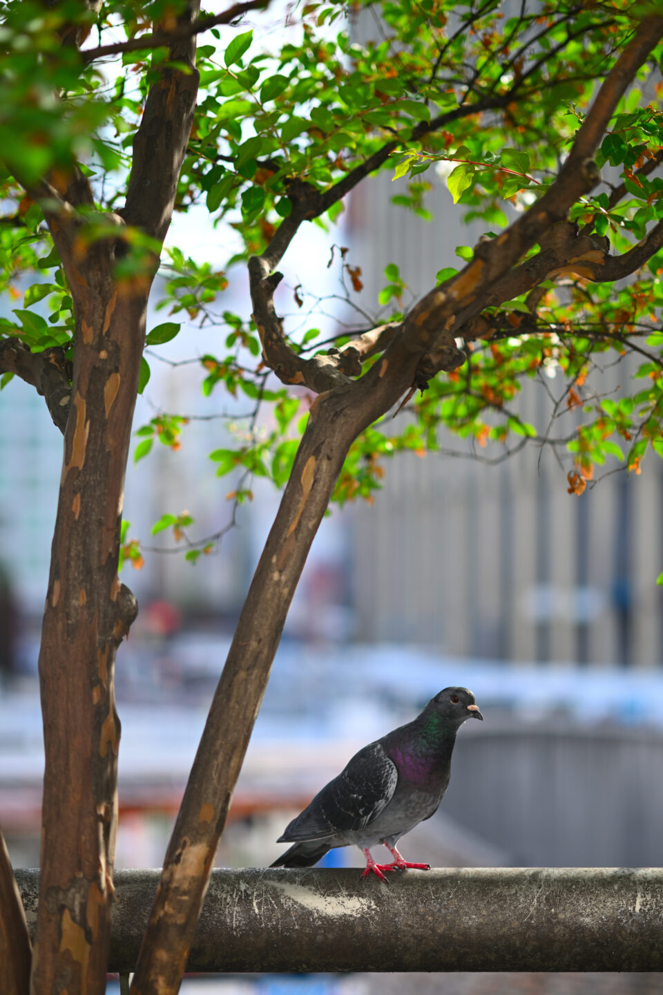 街なかで見つけたハトは、まるで撮ってくれというように手すりをトコトコと歩いていました。シングルポイントAFでピントを合わせてシャッターを切った一枚です。動く被写体ですので、当然ピントが合っていないカットもありましたが、満足の行くピントのカットを量産してくれました。