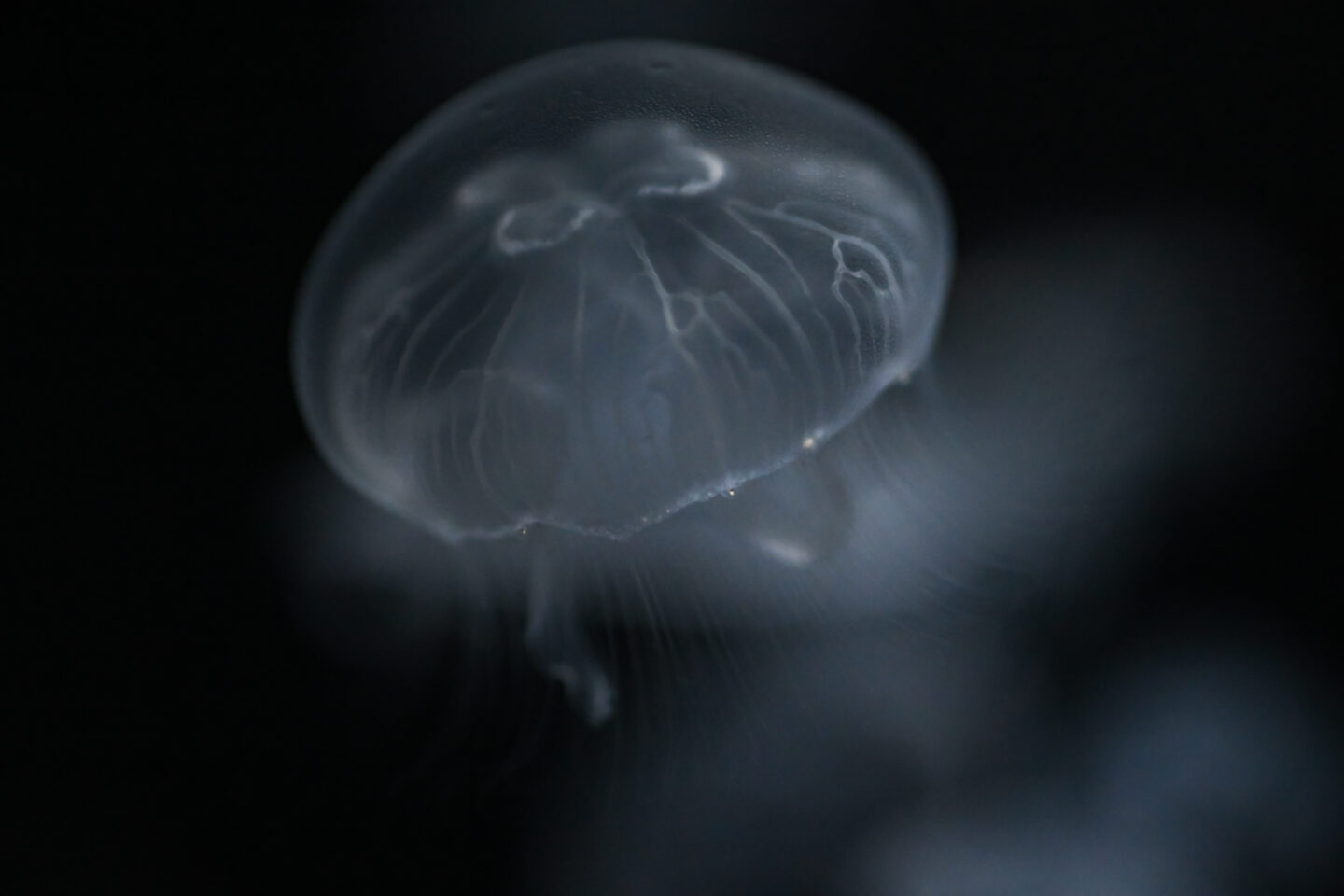 ミズクラゲはカサのゼラチン質の透明感と、細い触手の繊細さがフォトジェニックな、お勧めの被写体です。一匹だけ撮ると寂しい雰囲気になってしまうのですが、背景に他のクラゲを入れるとボケとなって奥行き感を演出してくれるので、大きなボケを作り出せる本レンズでは積極的に使いたい撮影方法です。