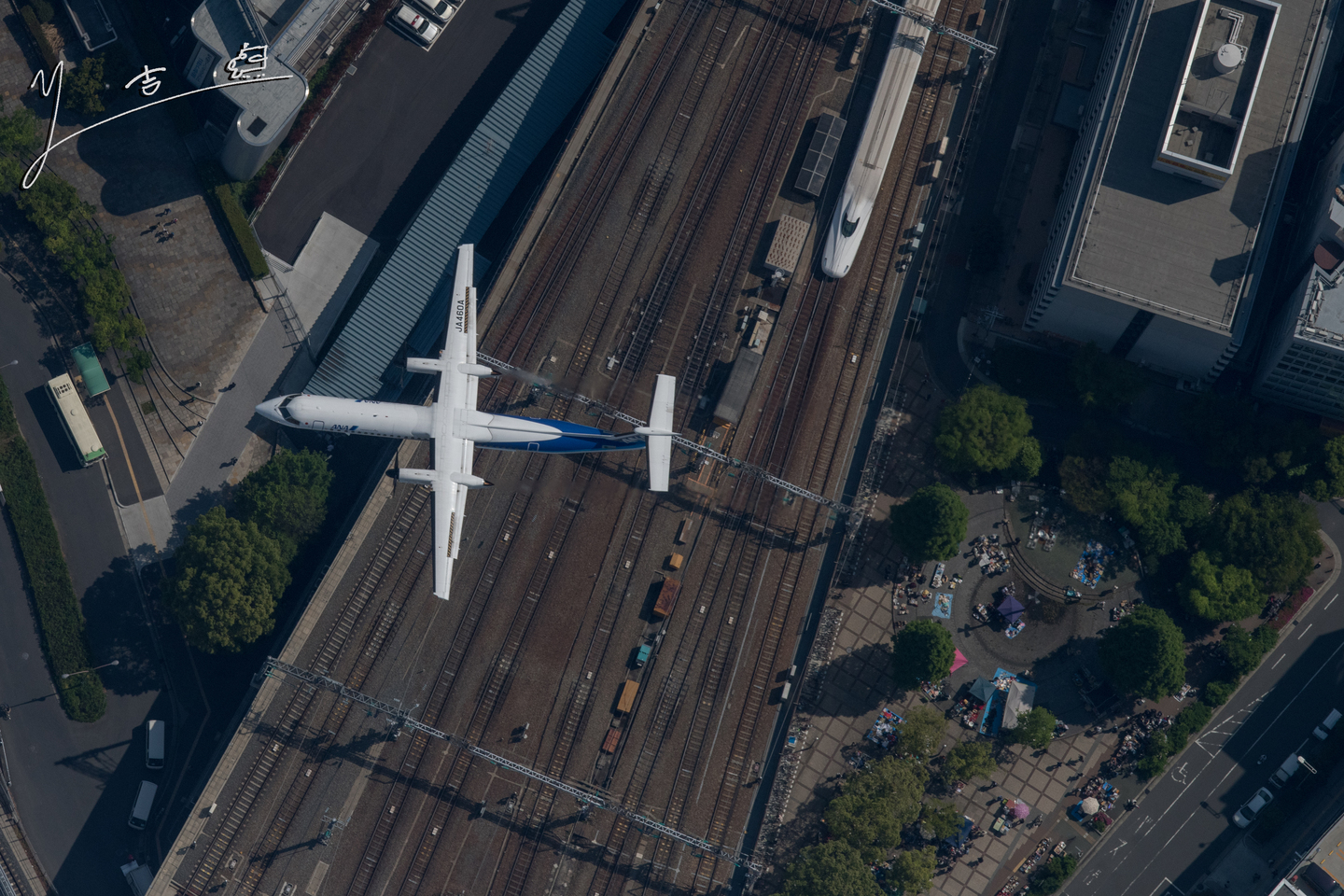 新大阪駅の東端で、N700系とボンバルディアDHC8型機がクロス。新幹線の高架下ではフリーマーケットや、路線バスが停車していることなど、この1カットで様々な一瞬が垣間見えます。
