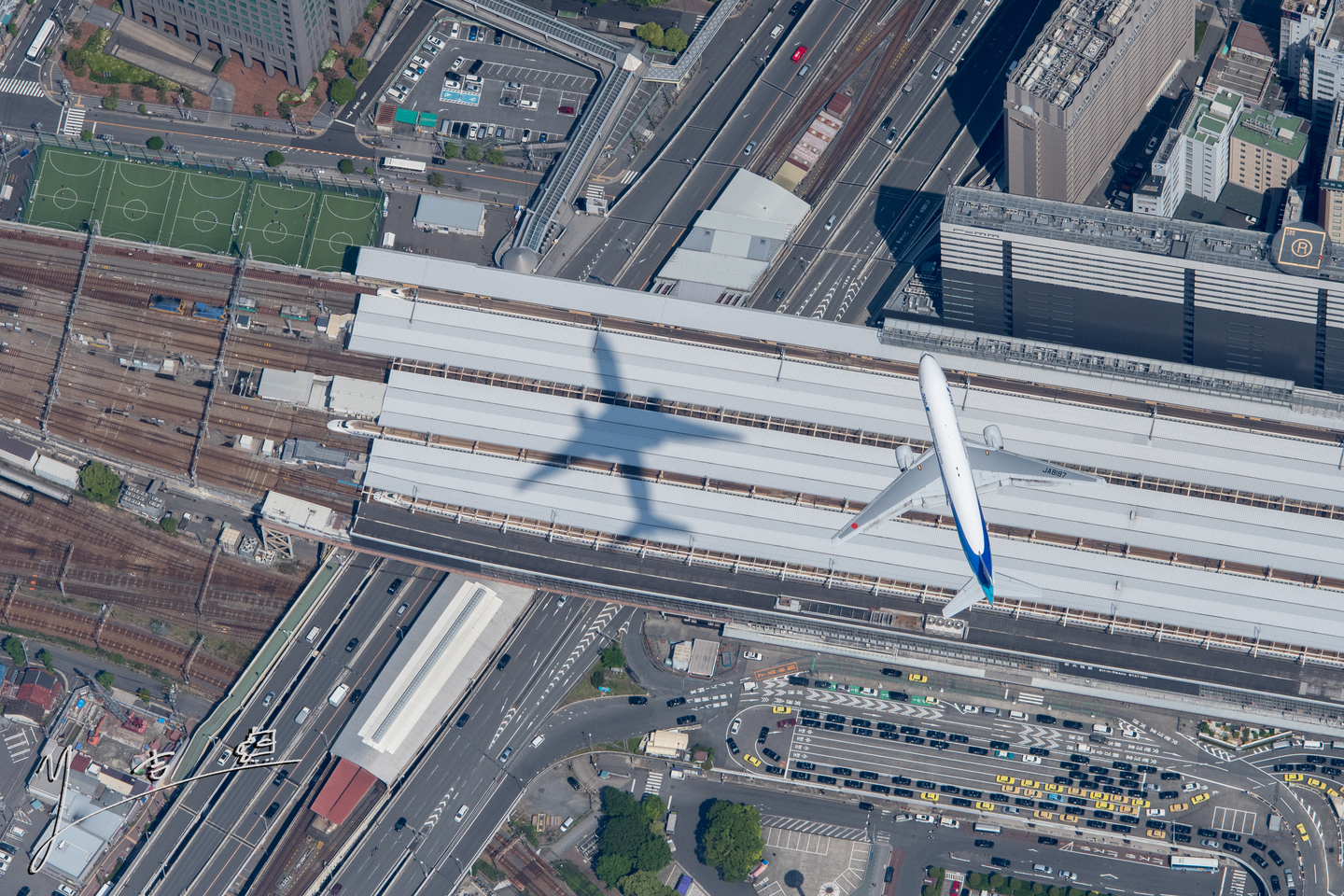 新大阪駅の真上を飛行しながら伊丹空港を目指すB777型機、駅には東海道・山陽新幹線のN700系、700系が停車しており、B777の影がくっきりとホーム屋根に写っています。