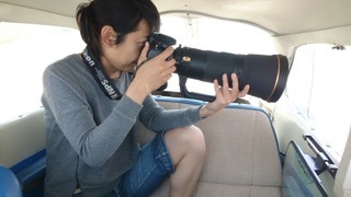 セスナ機の機内は大変狭く、超望遠レンズを構えるとご覧のとおり。揺れる機内では三脚を使っても意味がないので、どんなレンズでも手持ち撮影です。手ぶれ補正機能が助かります。