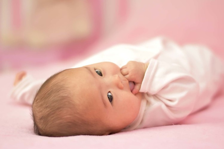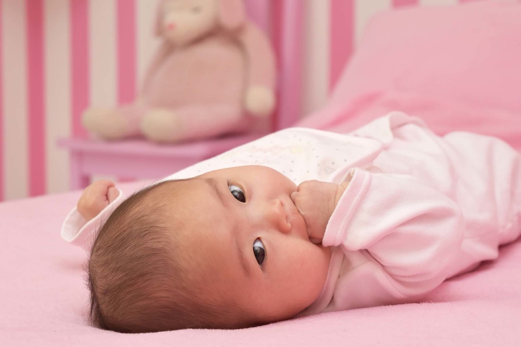 開放値のF1.4で撮影した写真(上)は、後ろのぬいぐるみがボケているので、手前の赤ちゃんが主役として引き立っています。F5.6で撮影した写真(下)は、後ろのぬいぐるみと壁紙の主張が大きいので、赤ちゃんの表情よりもどんな所で撮影したかが気になる写真に仕上がっています。