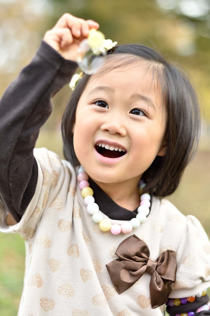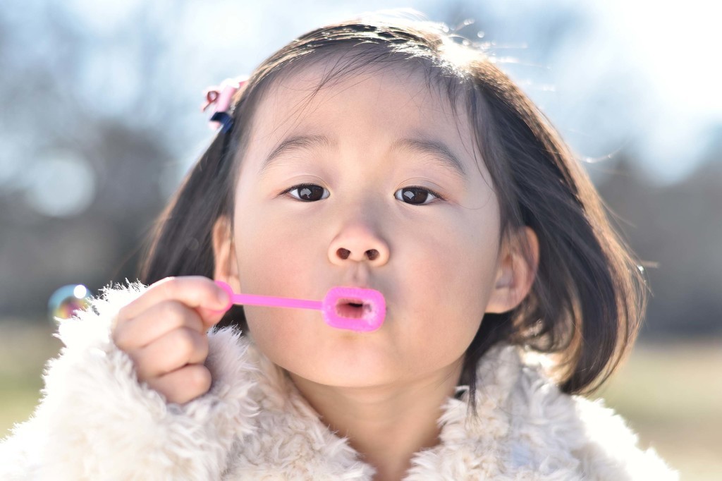 大きなボケを作れる単焦点レンズをカメラに付けていざ撮影となっても、肝心のお子さんがカメラの前にいてくれないと写真は撮れませんよね。お子さんの笑顔を引き出しながら、一ヶ所にじっとしてもらうお勧めの方法は「シャボン玉」です。