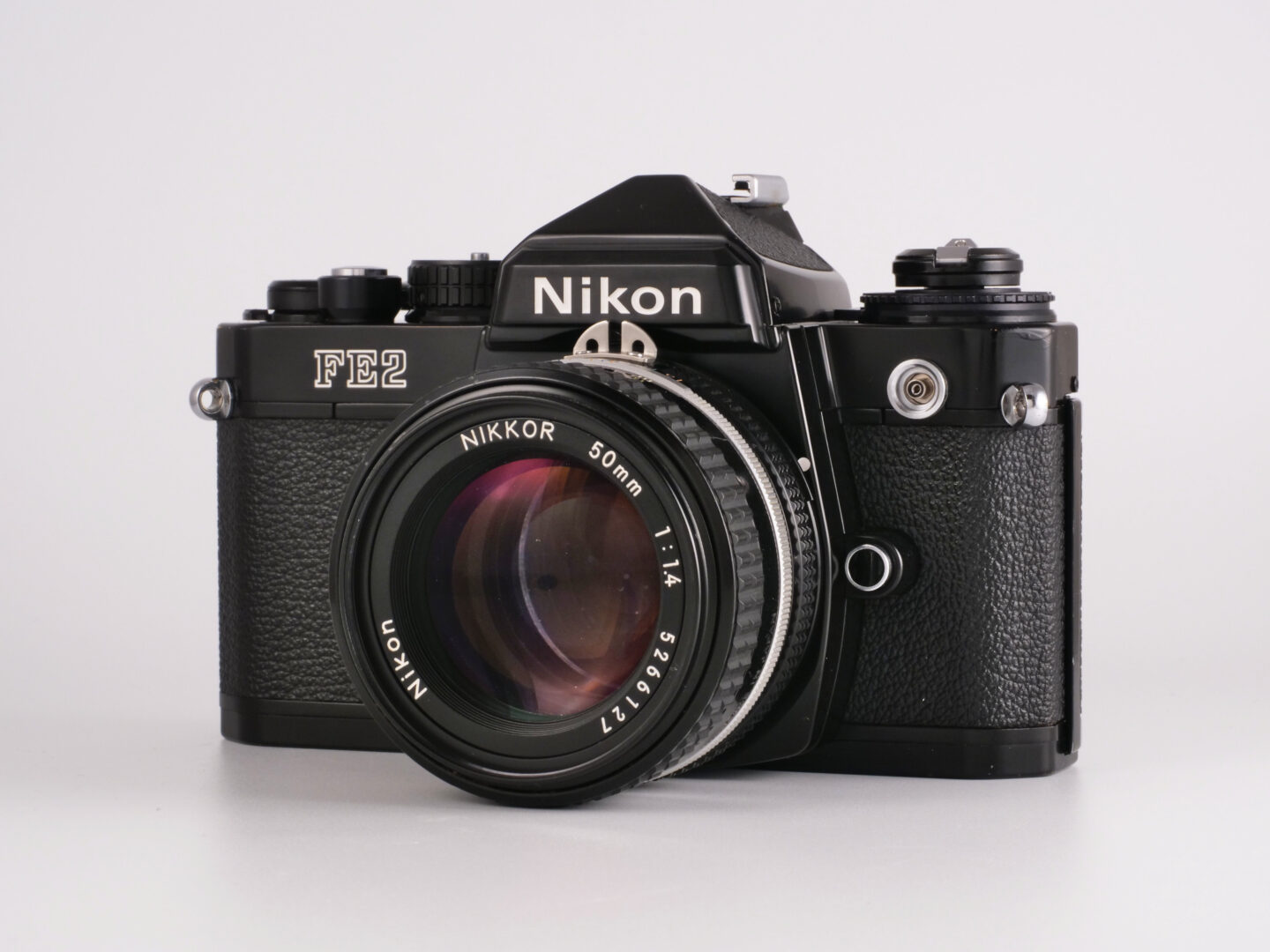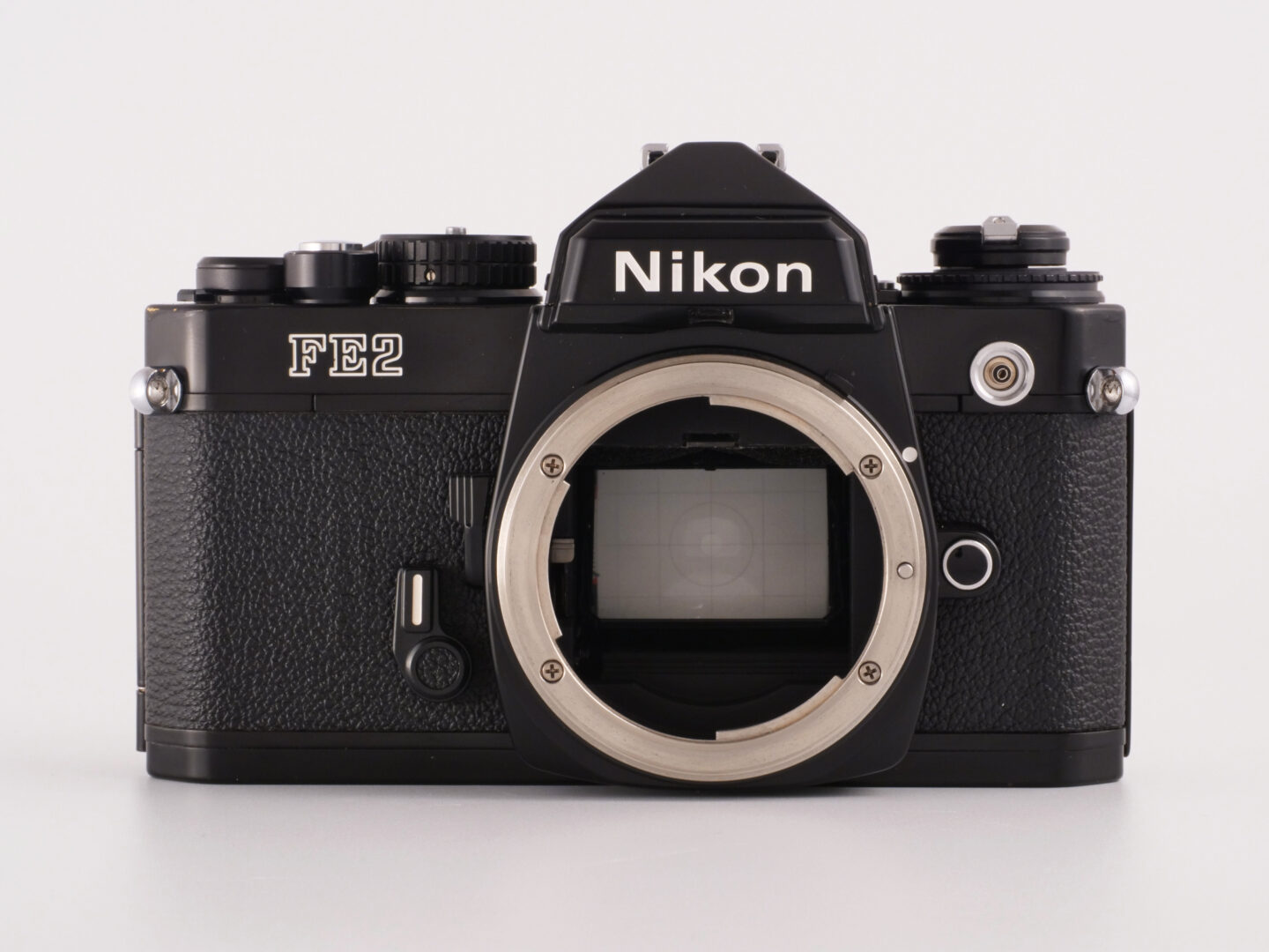 ニコン FE2は、1983年に発売開始された絞り優先AEおよびマニュアル露出が可能な35mm判一眼レフです。ニコンFマウントを採用したマニュアルフォーカス機で、1980年代初頭としては驚異的なシャッター最高速度1/4000秒を実現。FE2の発売から遡ること1年前にTTL露出計連動のマニュアル機であるFM2で1/4000秒は達成されていますが、FE2ではフラッシュシンクロ速度が1/250秒であることがアドバンテージで、その後このスペックはNew FM2にも採用されていきます。フラッシュシンクロの高速化は当時の報道系カメラに強く求められていた性能でした。
