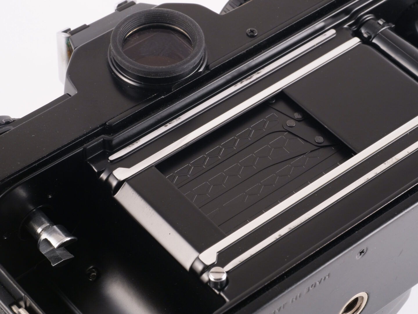 ニコン FE2のシャッターは、メタルのブレードが縦方向に走行するスクエア型の構造です。横に走るシャッターよりも短い距離を走行するので原理的に最高速度が出しやすいのですが、1/1000秒止まりの速度を1/4000秒まで持っていくにはシャッターブレードの耐久性を上げる必要があります。そこでチタン素材をエッチングしてハニカム状のパターンを持たせたシャッターが採用されています。この部品は後期モデルではアルミ製の平板に変更されますが、見た目としてはハニカムシャッターのほうが豪華で先端的な印象があります。