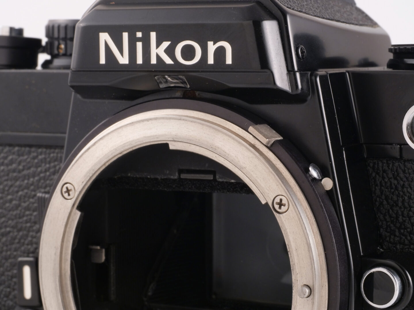こちらは先輩モデルのFEを同ポジションで撮影したもの。正面から見て1時半あたりの位置に金属製の出っ張りがあります。これはFE2と同様に装着したレンズの絞り値をボディに伝えるものですが、ロック解除ボタンを押せば倒すことができるのでAi化以前のニッコールレンズも気持ちよく装着できます。この機構を盛り込むためには多くの部品点数が必要で、樹脂の一体整形品と比べるとコストが掛かっているのが分かります。ちなみにAi化以前のニッコールレンズ装着時には絞り込み測光となります。