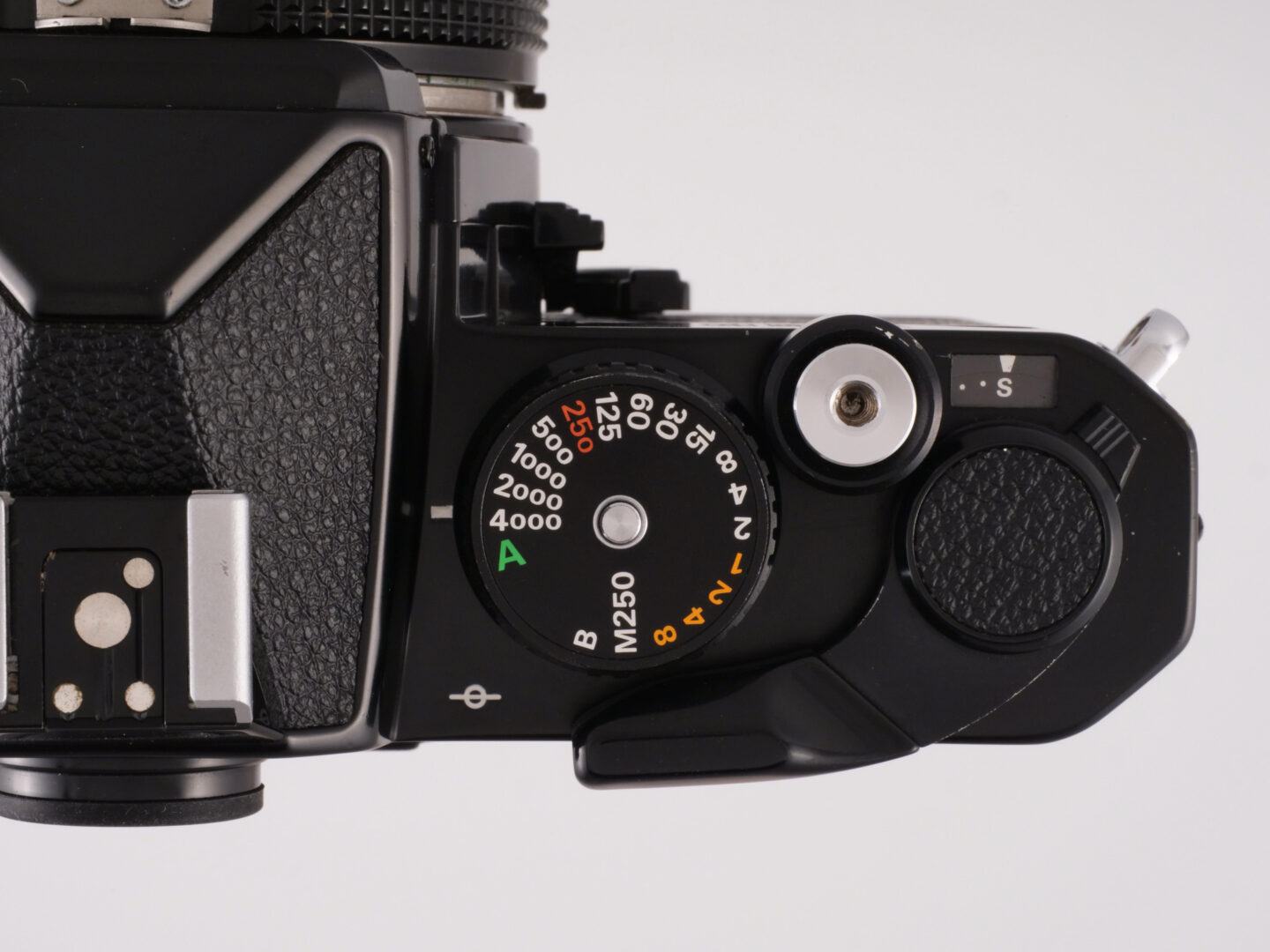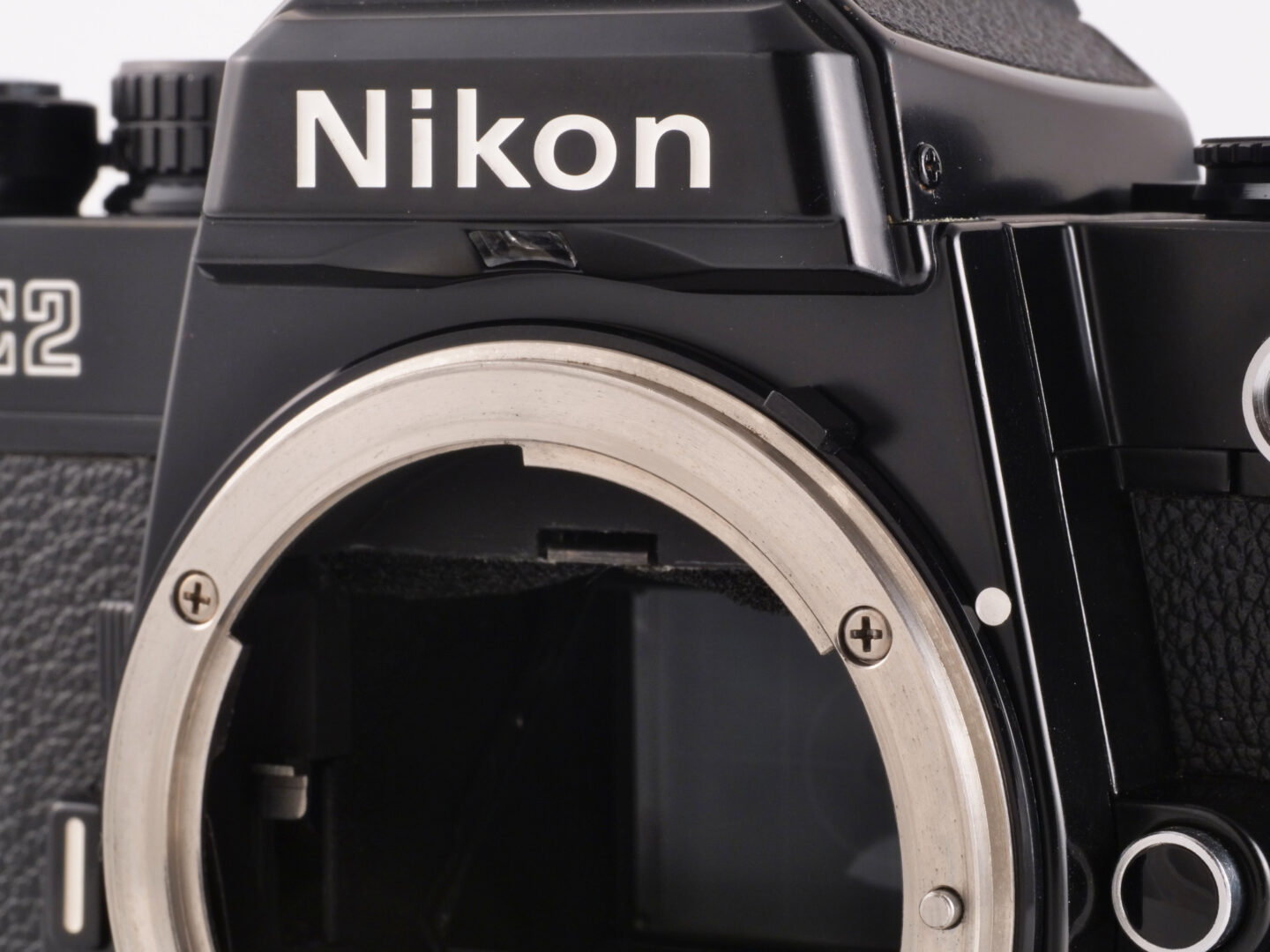 こちらは先輩モデルのFEを同ポジションで撮影したもの。正面から見て1時半あたりの位置に金属製の出っ張りがあります。これはFE2と同様に装着したレンズの絞り値をボディに伝えるものですが、ロック解除ボタンを押せば倒すことができるのでAi化以前のニッコールレンズも気持ちよく装着できます。この機構を盛り込むためには多くの部品点数が必要で、樹脂の一体整形品と比べるとコストが掛かっているのが分かります。ちなみにAi化以前のニッコールレンズ装着時には絞り込み測光となります。