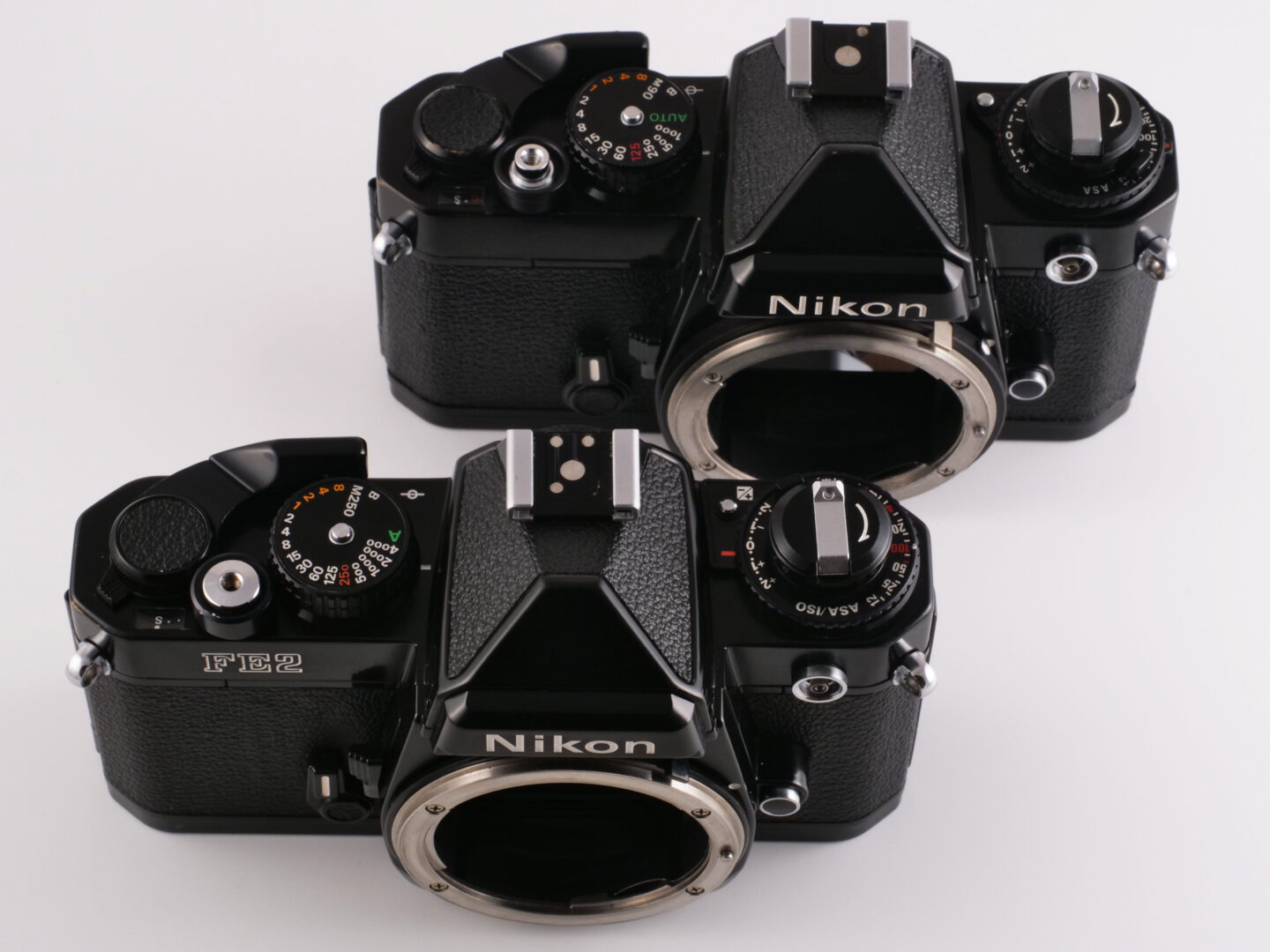 ニコン FEとFE2を比較してみると外観の印象は瓜二つで、新製品だから見た目を変えなければいけないという商業主義に流されることなく堅実な製品開発を進めていたことが分かります。両機の大きな差はシャッター最高速度ですが、ディテールを観察していくとFE2ではシャッターボタン周辺など生産性向上のため簡略化された部分もあり、手が込んだカメラが好きならばFE、高速シャッターなどの付加機能が重要と考えるならFE2という選び方になるかと思います。