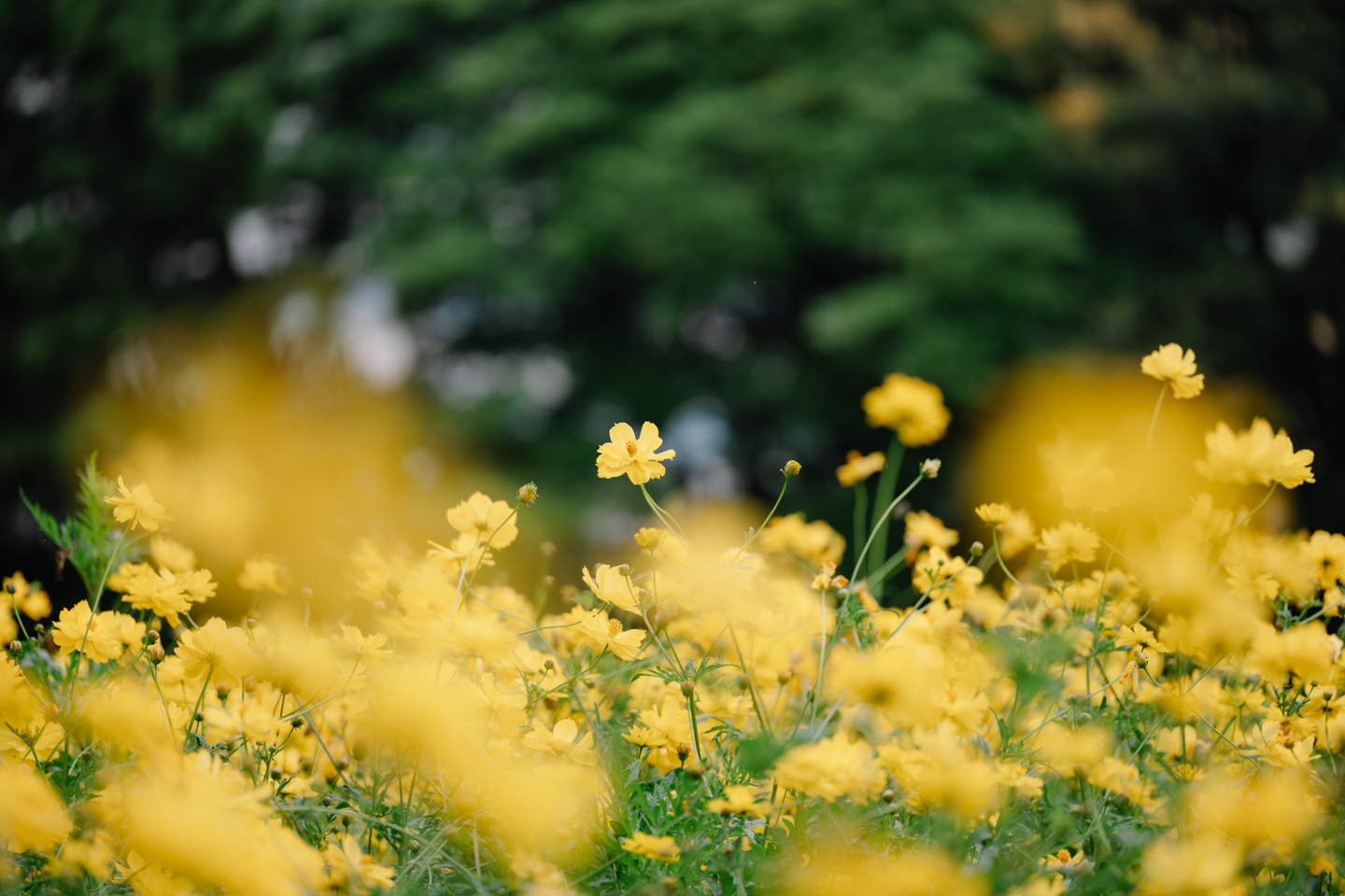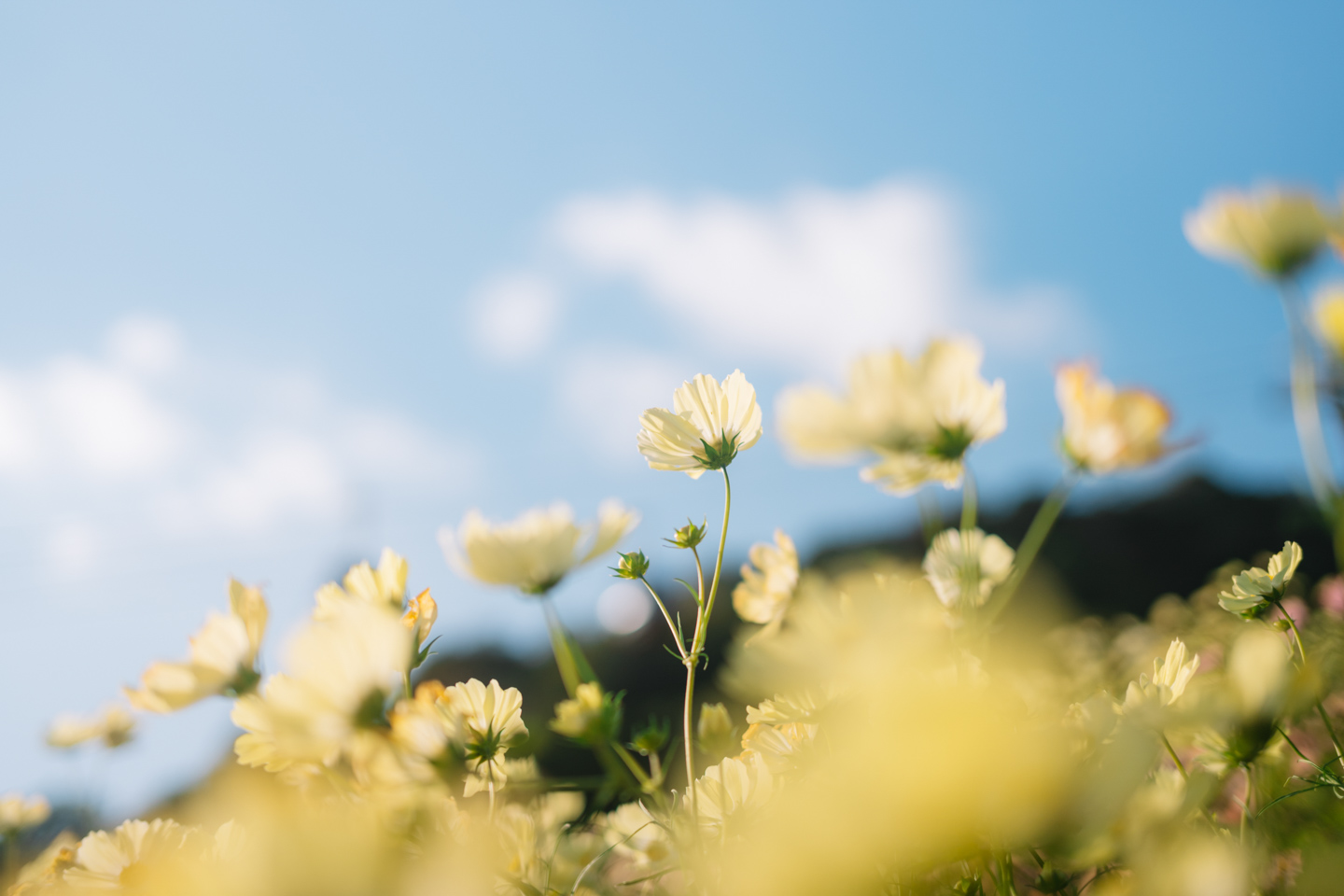 晴れの日は、色のコントラストを最大限に活かしてみましょう。澄んだ青空を背景に、奥の山が写り込みすぎて背景の邪魔にならないよう、ローアングルで撮影しています。黄色いコスモスと青空の組み合わせは、写真が爽やかな雰囲気になります。晴天時は光が強く硬い印象になってしまうので、少し逆光気味にすることで花びらを透かすと、柔らかな写真になります。