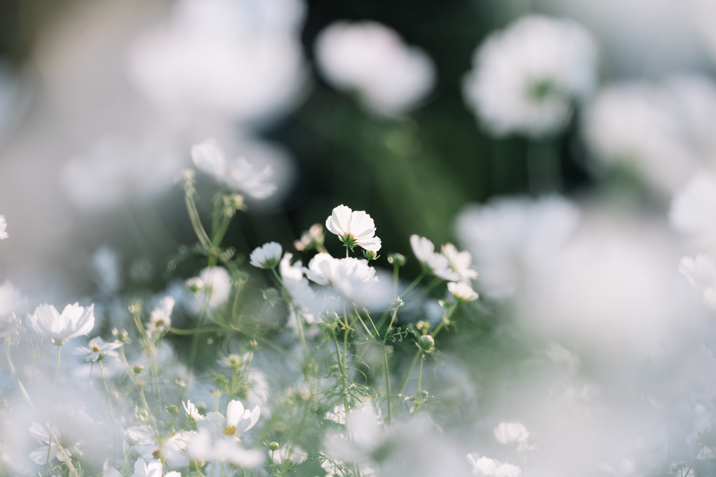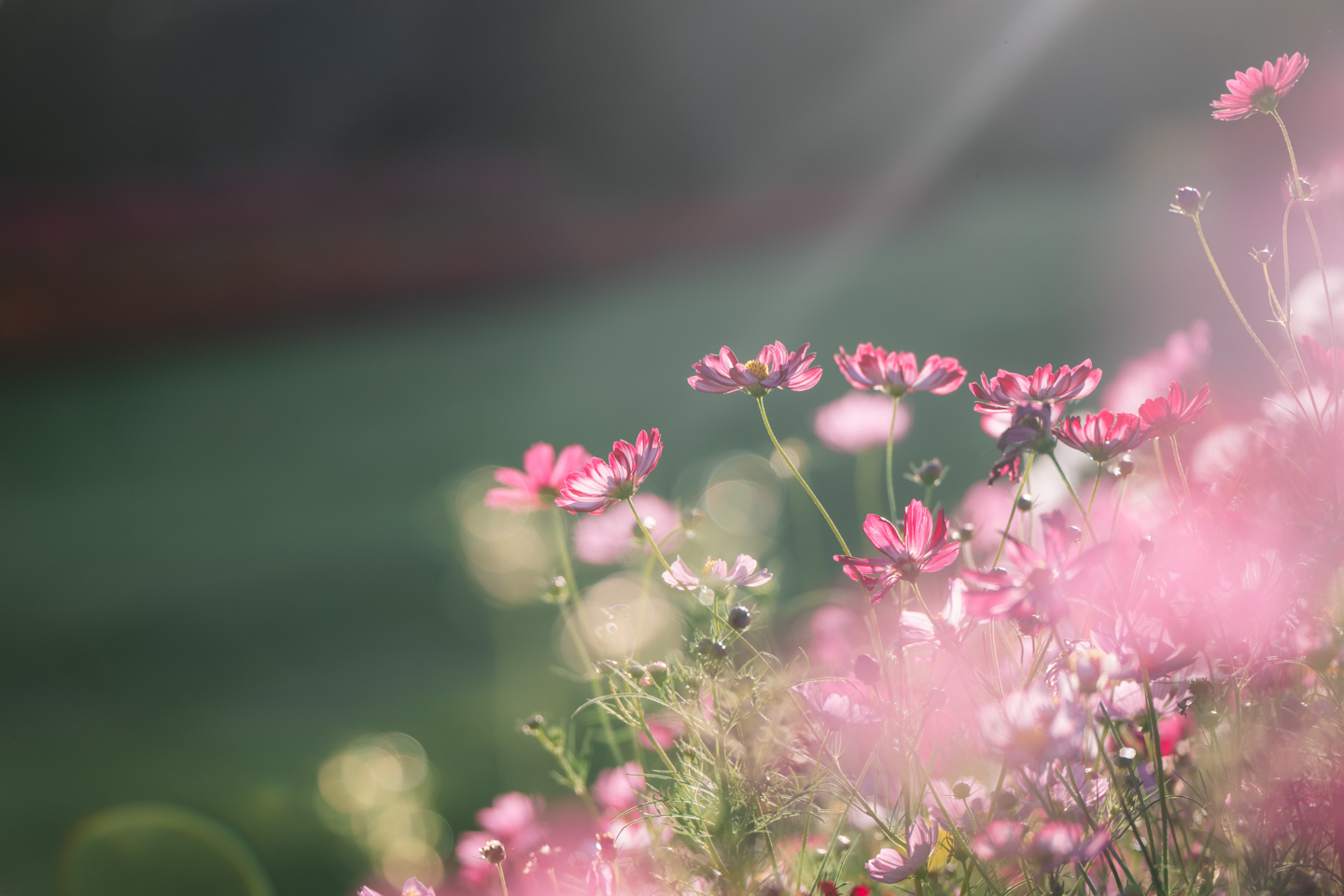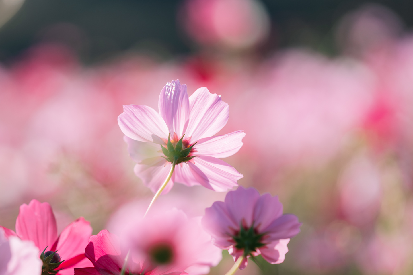 朝の光に包まれたコスモス畑。柔らかな逆光により、花びらが透き通るように輝いていました。前ボケを多く入れることで包み込まれる印象を強くし、幻想的な雰囲気を意識しています。
