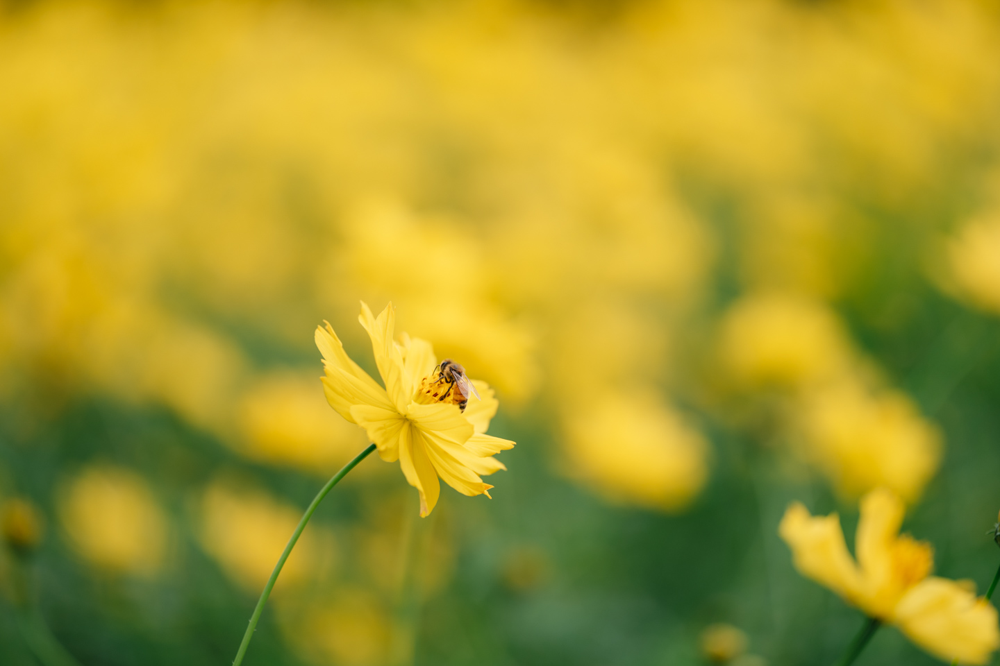 蜂が蜜を吸っている様子に、自然と目線を誘導するために三分割構図を意識しました。花と蜂を主役にしたかったのですが、花畑が広がっていることも伝えたいと思い、背景を大きくぼかしつつ余白を多めにしました。奥行きと広がりが感じられるのも、三分割構図の効果になります。