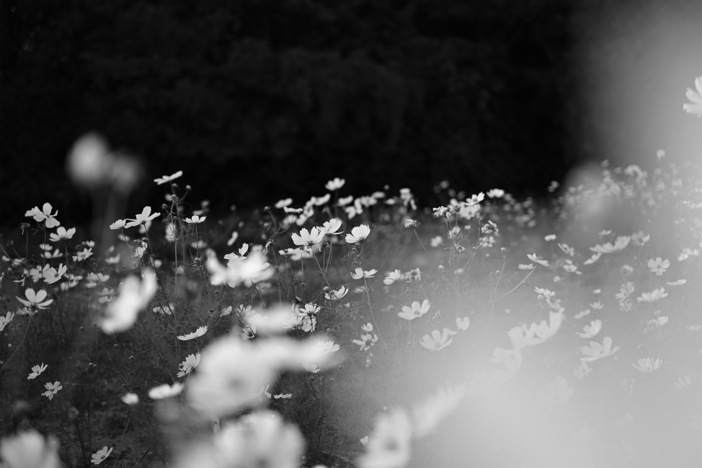 最後に、カラフルなコスモスをあえてモノクロで撮る表現をご紹介します。モノクロは色彩という情報量が減ります。色に頼らず、光と影のコントラストに目を向けることで、普段とは違ったコスモス写真となります。