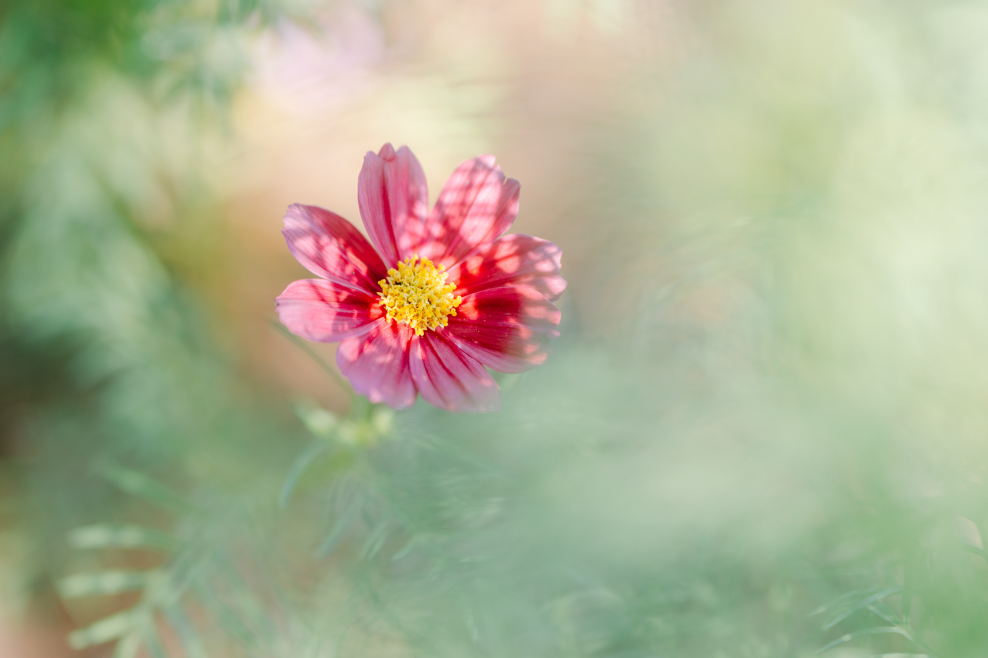 一輪だけ背伸びしているコスモスを見つけたので、前ボケで周囲を大きくぼかし、フィルターを使って朝の幻想的な雰囲気を強めました。