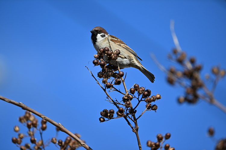 枝に止まって木の実を食べるスズメを撮りました。ちょこまかと枝から枝に飛び回りますが、「Z 9」の優れたオートフォーカス性能とこのレンズのマッチングによって、正確にスズメの瞳にフォーカスしてくれました。楽チンです。