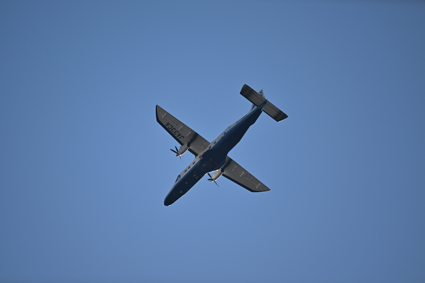 河川敷を撮影中プロペラ音がしたので見上げてみると、頭上を伊豆七島に向かう飛行機が通過するところでした。すかさず「NIKKOR Z 100-400mm f/4.5-5.6 VR S」を向けてシャッターを切りましたが、スッと合焦してその機体を捉えました。どのズーム域でも重量バランスがほぼ一定なのが撮りやすいですね。