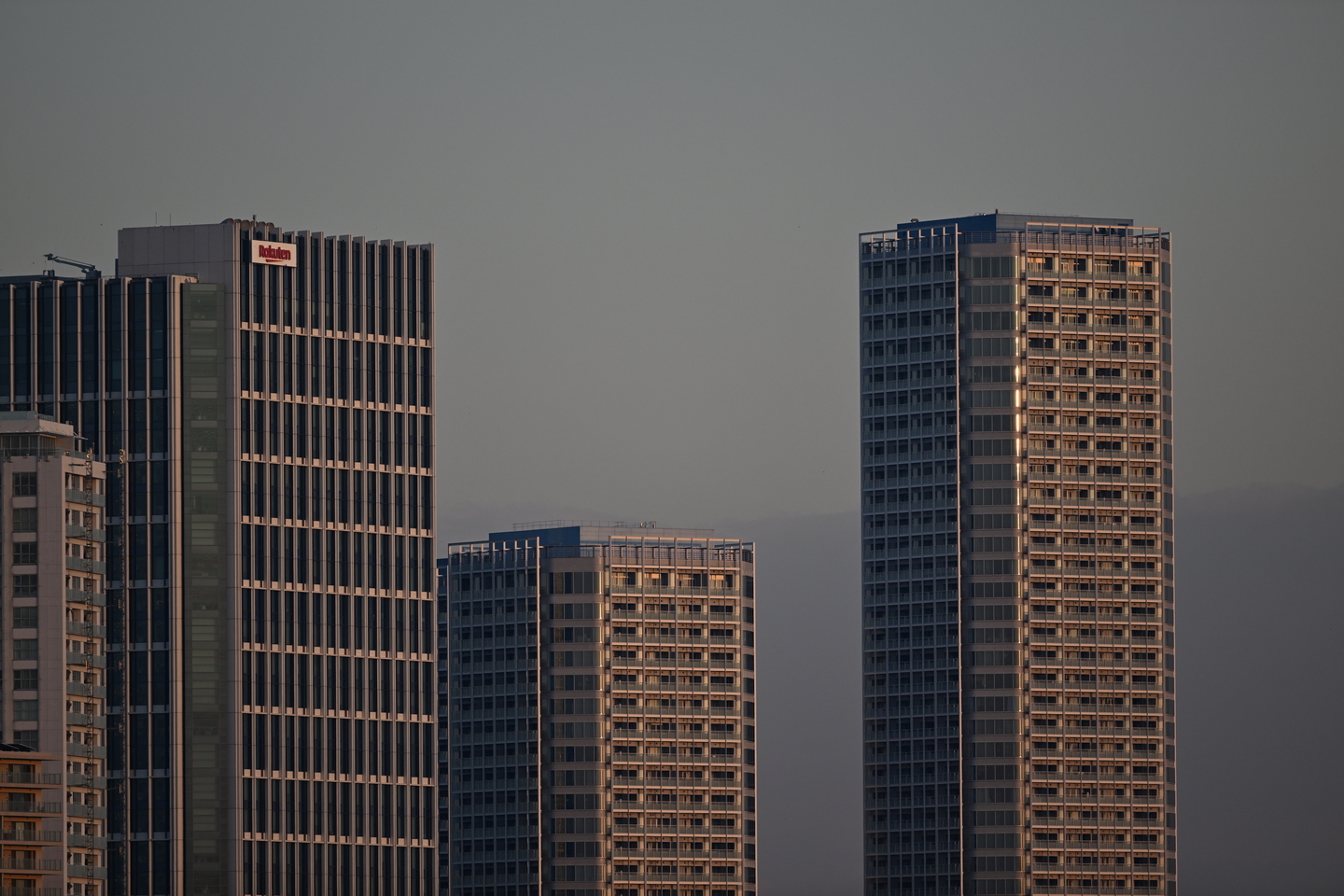 日没のビル群を手持ち撮影で。ファインダー内で像がビシッと止まる強力な手ブレ補正機能は確実にフレーミングができて重宝します。夕日に染まる微妙な色合いも、見た目通りにこのレンズは表現してくれました。