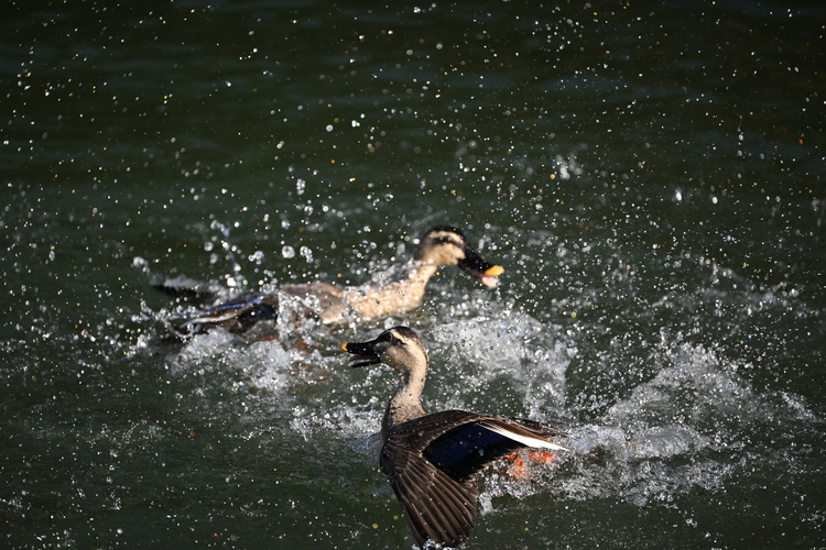 とある池で撮影中、カルガモ同士が盛大にケンカを始めました。その迫力あるシーンもこの超望遠ズームレンズがあればカンタンに捉えることが可能です。手前にいるカルガモの目にしっかりと合焦し、飛沫のキラキラ感とともに臨場感高いカットとなりました。