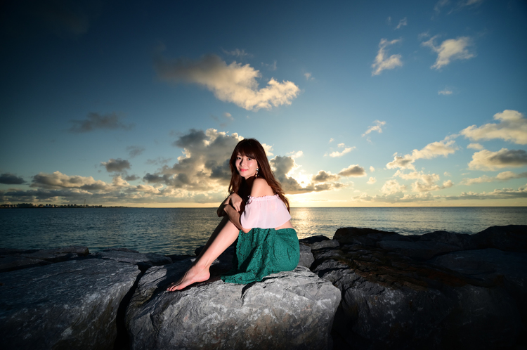 この作品では、背景にサンセットの海を入れたかったので、白トビしないようにNDフィルターを使って全体を暗くしています。その上で、モデルだけが明るくなるように、モデルの体の斜め前からストロボを強めに当てて撮影することで、岩陰や雲のない青空部分をわざと暗くして、トンネル効果を演出しました。