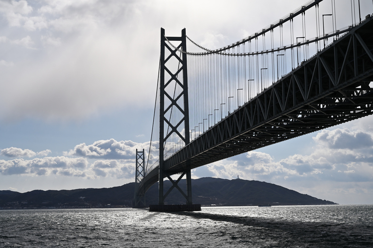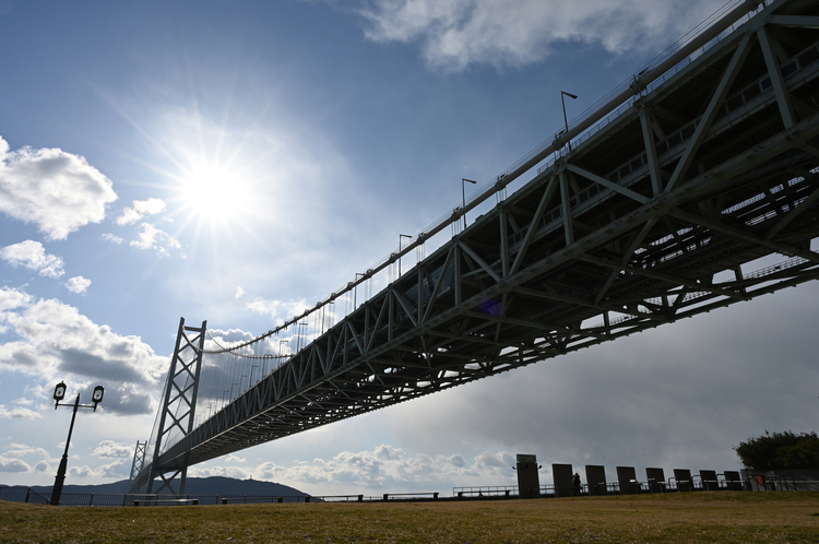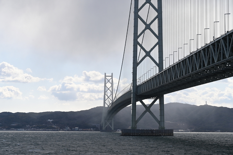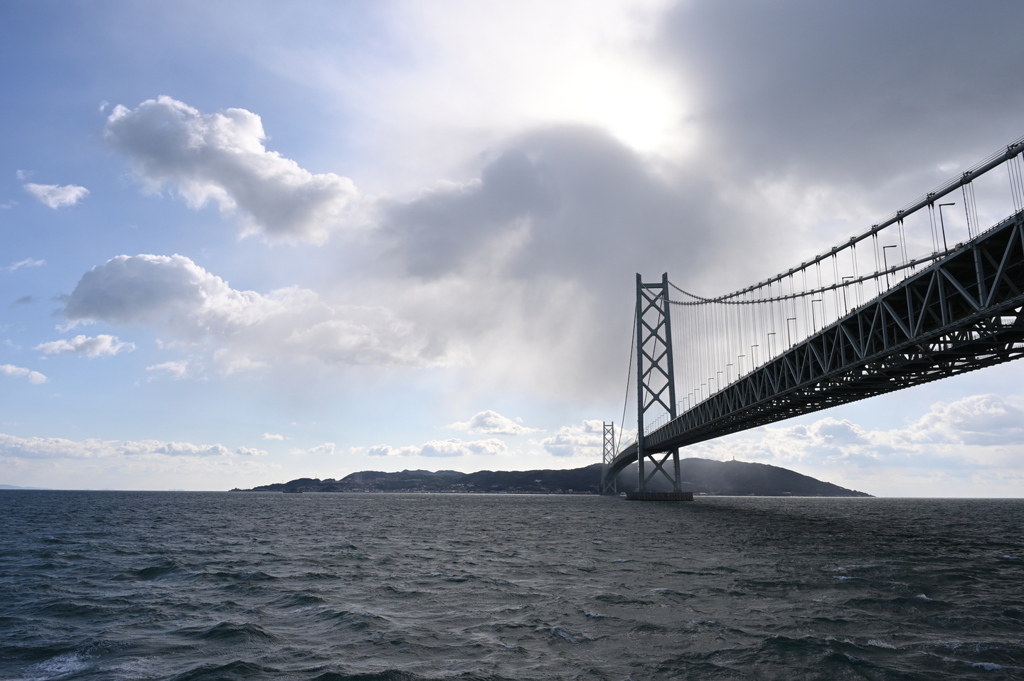 明石海峡大橋の袂にある舞子公園へ出掛けた日。この日は穏やかないいお天気と思って出掛けたにもかかわらず、突然お天気が急変し、まっすぐ歩くのも困難なほどの強風とともに低い位置まで白いものが立ち込めた雲が迫ってきました。よく見ると対岸の淡路島側の橋脚付近は白く煙っています。これはあのあたり、雪が降っているな〜と思い、引いて広角で全景を捉え、望遠側にズームして細かい雪に包まれた対岸を撮影。するとまた急にスポットライトのように陽の光が差してきて……。とてもじゃないけれどレンズ交換なんてできそうにない(したくない)強風の下、目まぐるしく変わる天候と同様に焦点距離もどんどん変えられるのはズームレンズの有り難い点であると実感したのでした。