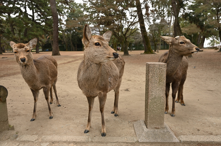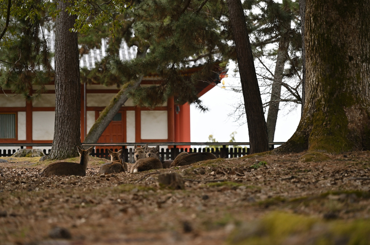 奈良公園の主ともいうべき、鹿。自由すぎるくらい自由に闊歩する彼・彼女たちは、鹿せんべいを求めて間近に寄って来たかと思うと、お目当てのものがないと知るや否や次のターゲットへ移動……こちらは広角から望遠まで、ズームリングをくるくる回しながらその姿をファインダー越しに追う……。こんな時にもやはりズームレンズは有り難いものです。