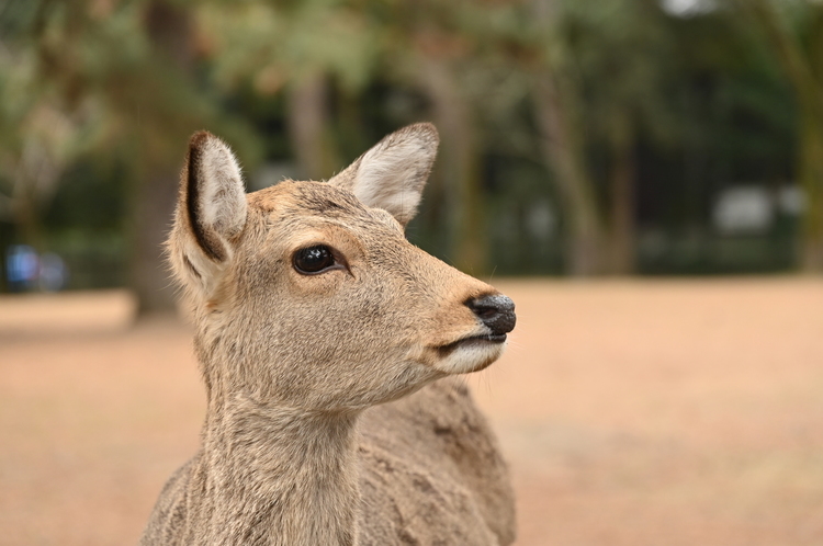 近くの被写体にピントを合わせると背景がボケやすくなりますが、そもそも広角ではどうしてもボケは小さくなりがちです。ここではまず鹿の顔の毛並みの解像感に見入ってしまいますが(笑)、場所の雰囲気や状況がわかる程度に背景がボケて、木立の隙間の光がまるい玉ボケになっています。
