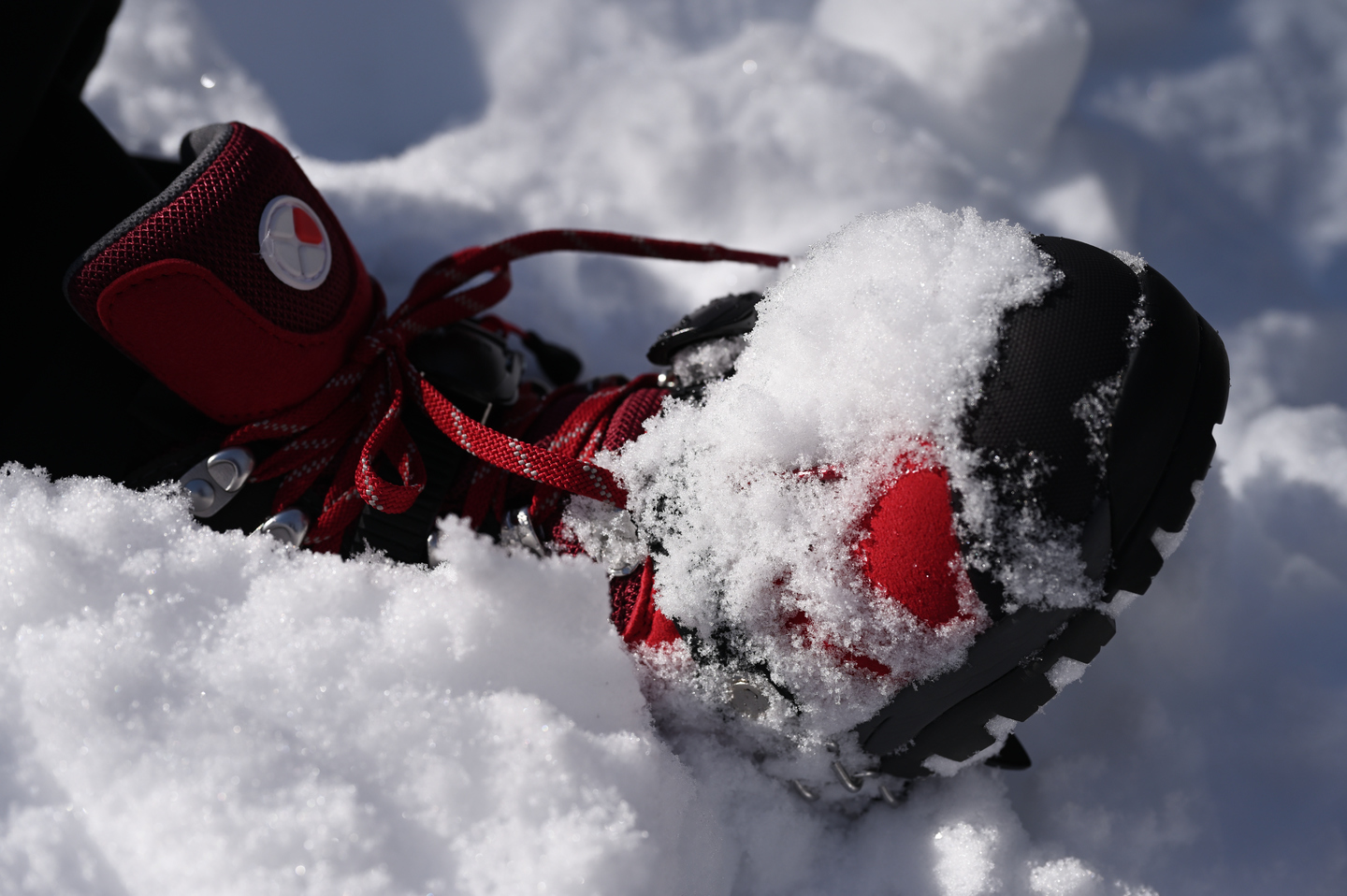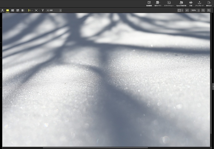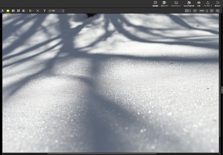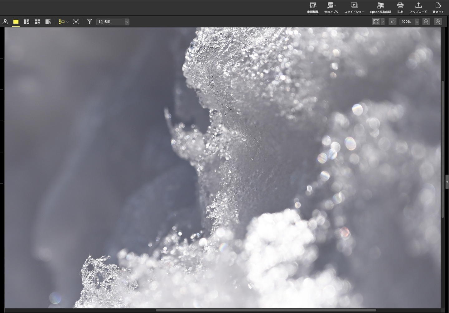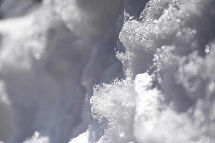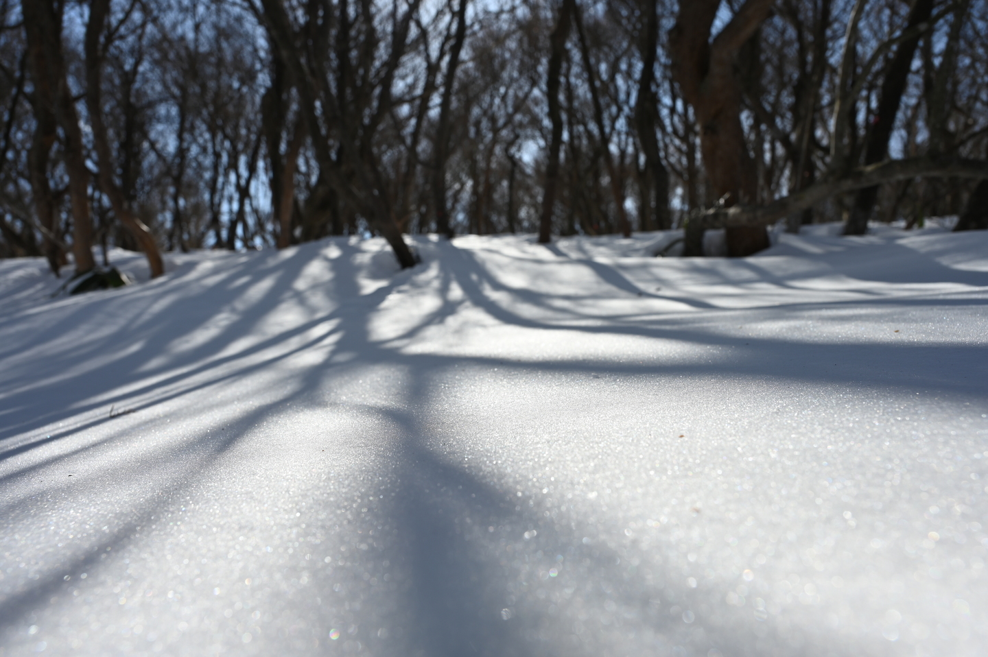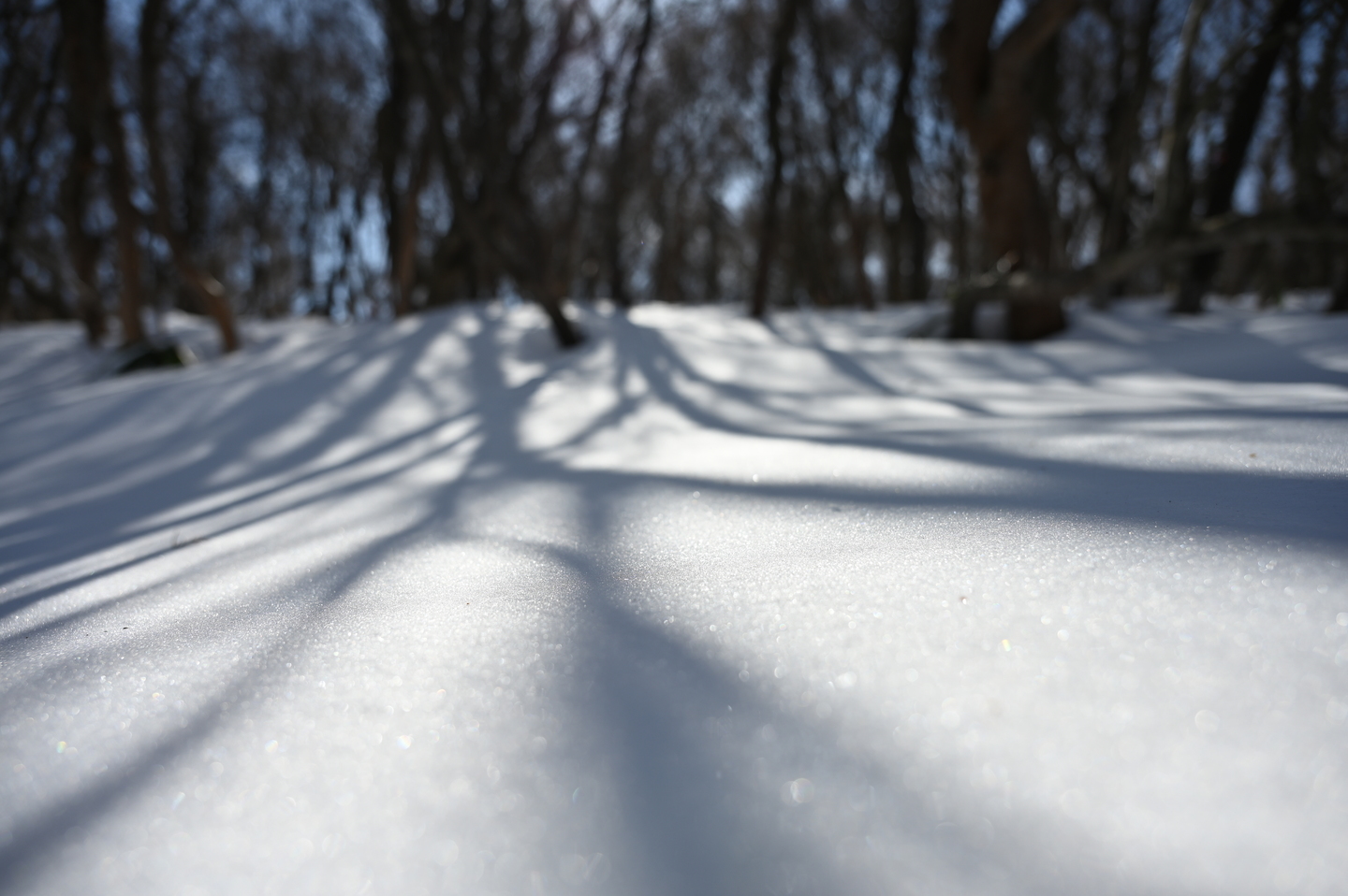 地面すれすれの高さまでカメラを下げて、モニターを見ながら開放(F4)とF8とで撮影。雪の表面のキラキラしたようすから細かな質感までを見事に捉えてくれています。