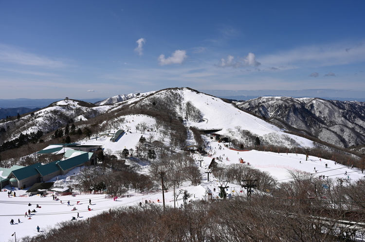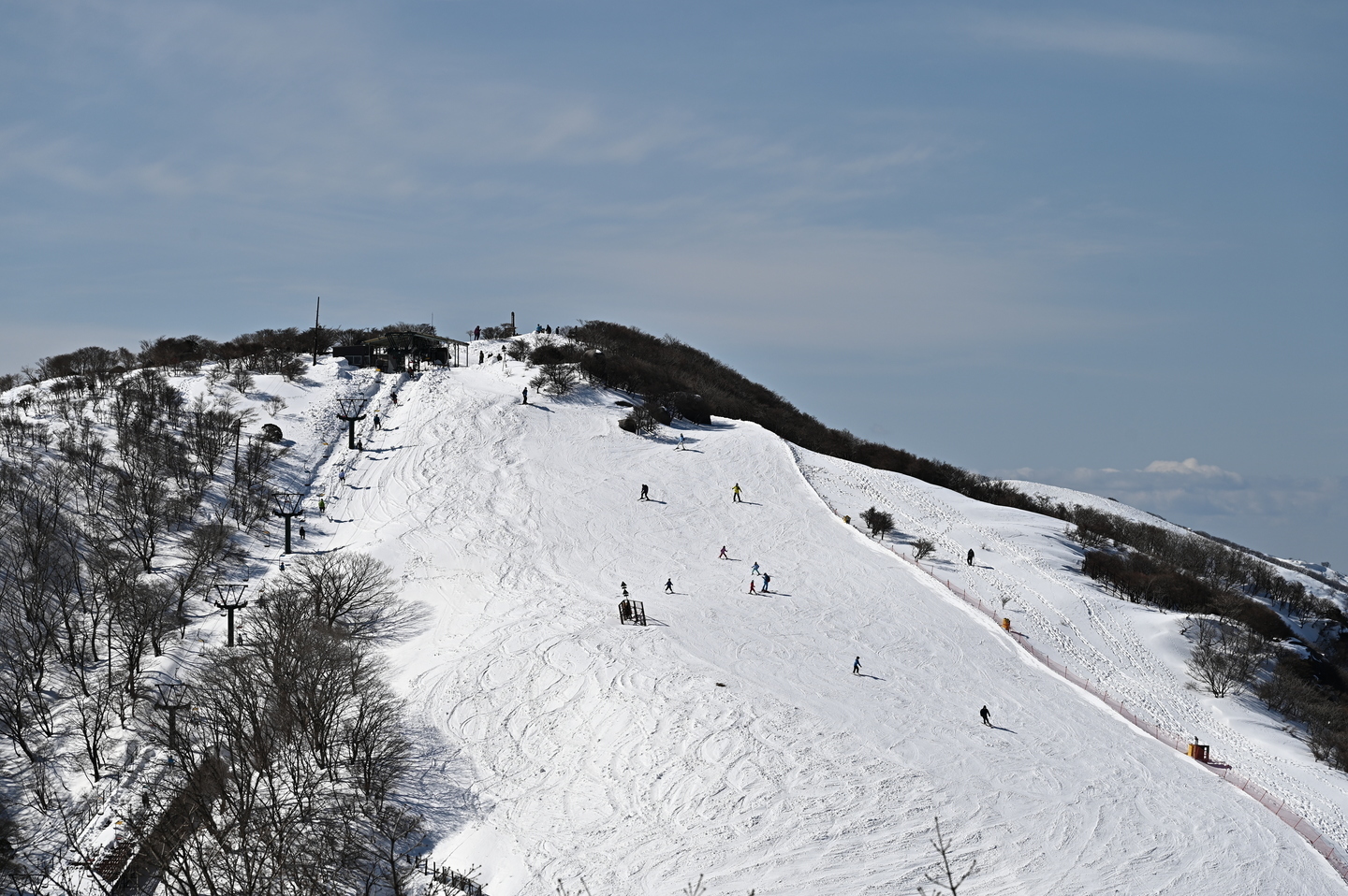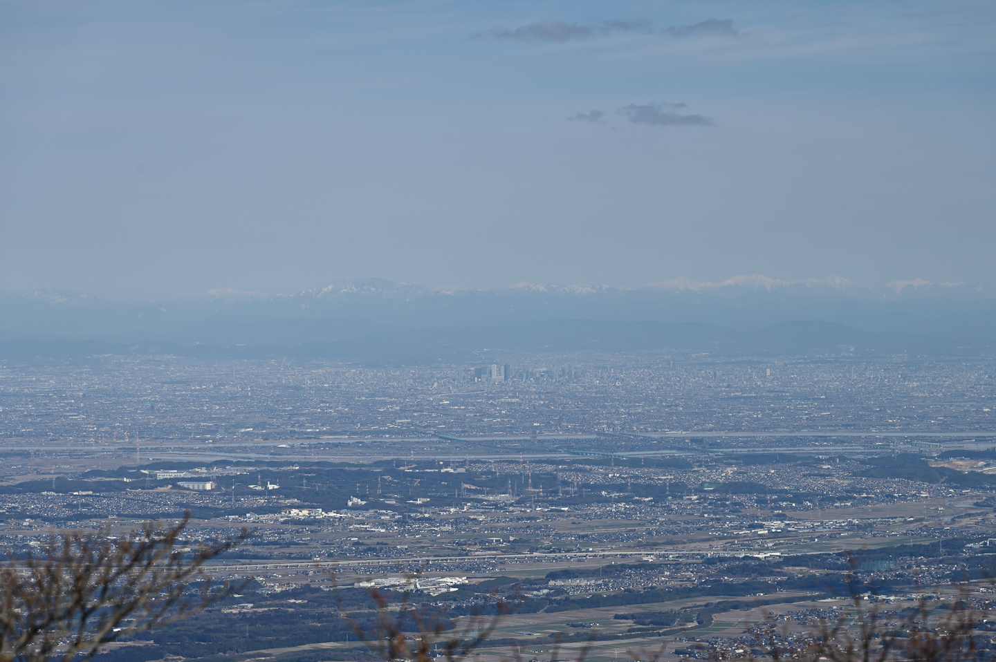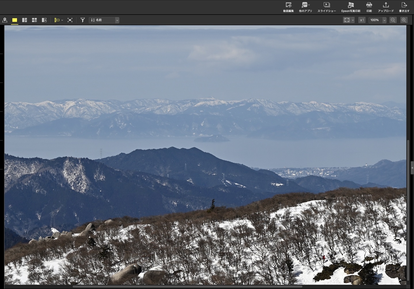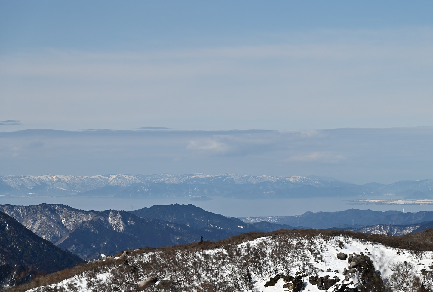 スキー場や展望広場の周囲を取り囲む遊歩道からの眺めが素晴らしく、肉眼で見て「あれはどこだろう?琵琶湖?!」「あそこに見えるのはもしかして名古屋駅じゃない?」「望遠で撮って拡大しみよう!」ということで撮った2枚。滋賀県彦根市の市街地と思しき街越しに広がるのは琵琶湖、そしてその対岸(海津大崎あたりでしょうか)までで直線距離にして約56km。さらにその奥で雪を纏った比良山地の山々までをしっかり捉えています。