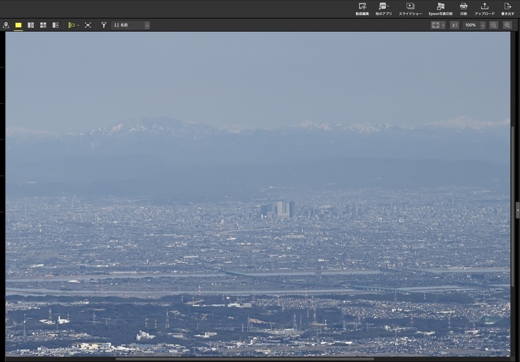広大な濃尾平野の一角にそびえ立つビル群。もしかして名古屋駅周辺?と思って拡大してみると……ビンゴ!でした。名古屋駅まで、直線距離で約45km。そのはるか向こうには中央アルプス方面の山々までが見て取れます。