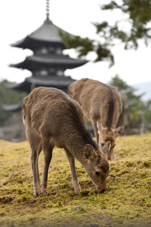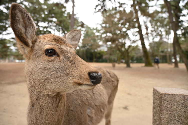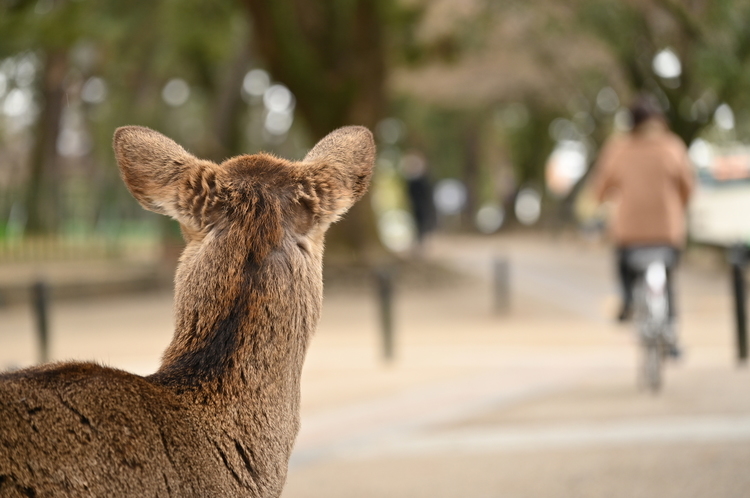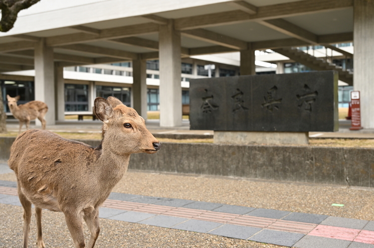 人間に物申したいことがあるとかで県庁を訪れたものの、この日は週末とあって役所はお休み!シカたなく向かいの奈良公園に帰るところだそうです……知らんけど笑。ご存知、奈良では鹿が街中を闊歩する場面によく出くわします。背景を見ながら動き回る彼らをフレームに収めるためにはやはりズームレンズは便利です。