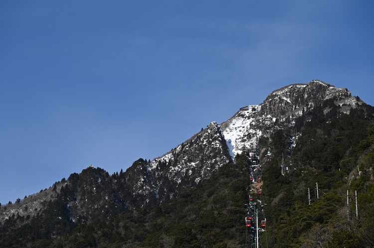 御在所岳の山麓、標高約400mに位置する御在所ロープウエイの乗り場から山上公園駅(標高1,180m)を見上げて。焦点距離120mmであれば、そのスケール感が感じられる程度の画角と圧縮で、途中には日本一高い支柱(高さ61mの白鉄塔)も見て取れます。