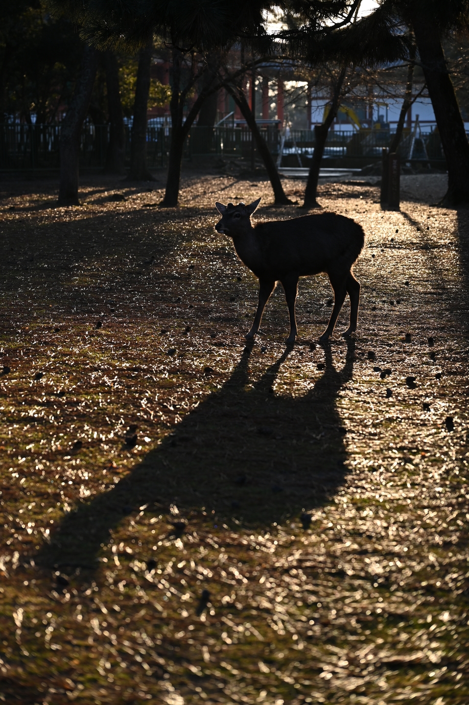 雨上がりの夕方、長く伸びる鹿のシルエットを追いかけて。やはり逆光に強いレンズであることを実感します。